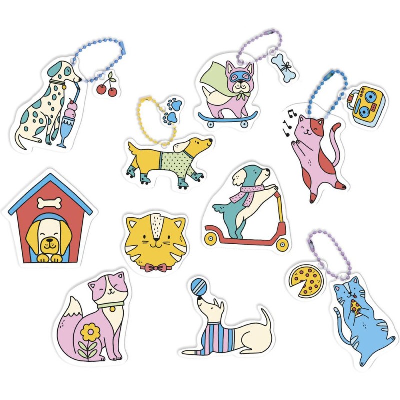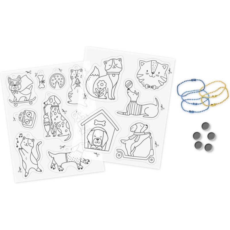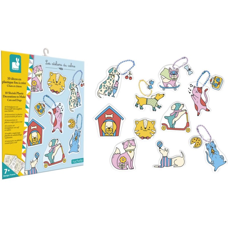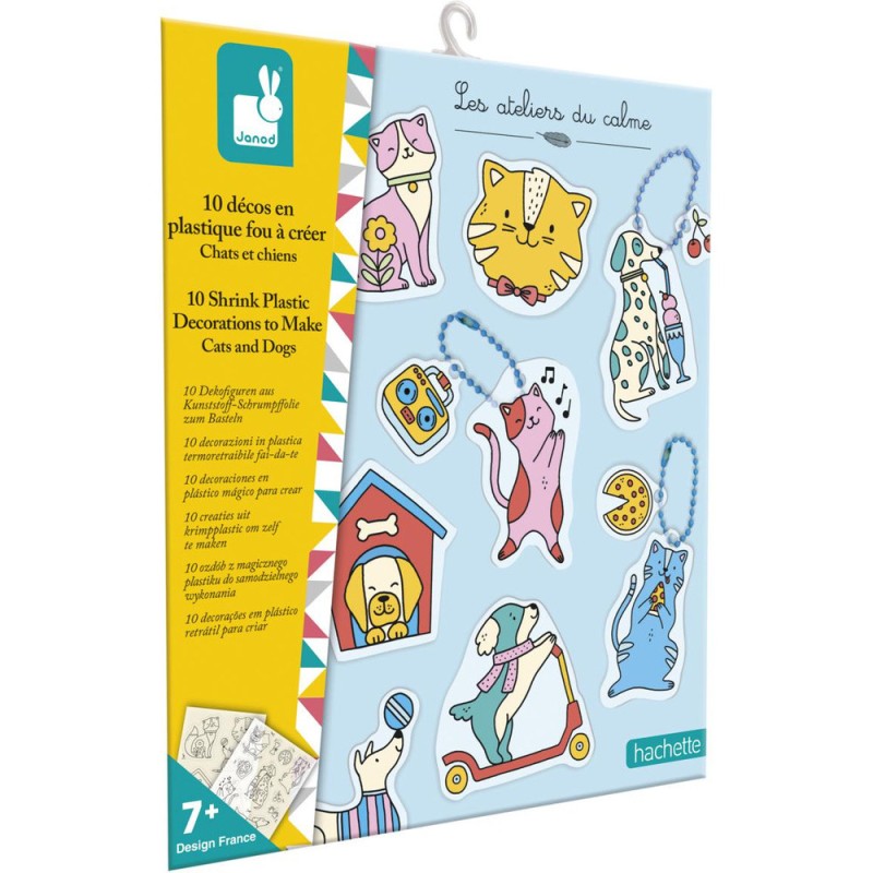 Des décorations complétement folles ! Avec ce kit créatif, les enfants créent 10 décos chats et chiens grâce à la technique du plastique fou, dès l’âge de 7 ans. La pochette contient tout le nécessaire pour réaliser 5 porte-clés et 5 magnets. Voilà une activité idéale pour développer la créativité et la patience, mais aussi la dextérité des enfants ! Mais connaissez-vous le plastique fou ? C’est super simple : on colorie d’abord les dessins, on les découpe, puis un adulte préchauffe le four à 150° avant de disposer les décos sur une plaque. Et la magie opère ! Une fois refroidies, il n’y a plus qu’à accrocher ses créations à sa trousse ou à les afficher sur le réfrigérateur à l’aide des aimants fournis. Ce kit de décorations en plastique fou contient : 2 feuilles de plastique fou déjà imprimées, 5 chaînettes avec fermoir, 5 aimants adhésifs, et 1 livret avec les instructions et les modèles. Il ne reste plus qu’à laisser parler sa créativité et à suivre chaque étape ! Il faudra compter environ 10 minutes pour réaliser chaque décoration. Alors, plutôt chat ou chien ?