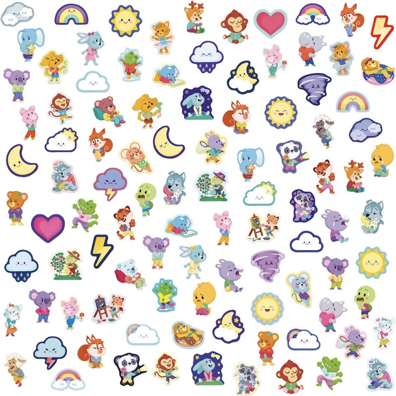 Une façon ludique de se familiariser avec les émotions ! Cette pochette de 100 stickers sur le thème des émotions est conçue pour les enfants dès 3 ans. Avec autant de gommettes, il y a de quoi s’amuser et exprimer ses ressentis… pendant des heures ! Pour ravir les amateurs d’autocollants, ouvrez ce joli pack en forme de petit tigre malicieux et découvrez un univers plein de tendresse : des animaux expressifs et des éléments comme un soleil et un nuage, chacun illustrant une émotion différente.