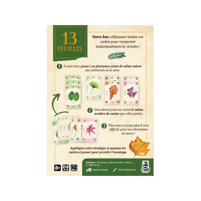 Dans 13 Feuilles, vous devez vous débarrasser de votre main de cartes en premier si vous voulez gagner la partie. Plus vous posez un nombre élevé d’une même valeur, plus il sera difficile pour vos adversaires de suivre. Alors gérez astucieusement votre jeu pour les pousser à passer, sans vous faire prendre à votre propre piège !