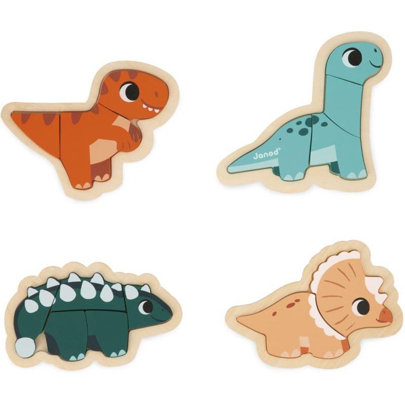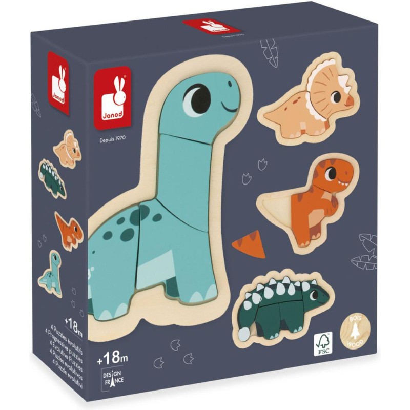 Avis à tous les petits fans de dinosaures ! 4 beaux spécimens sont de sortie pour divertir les plus petits mais aussi pour les faire réfléchir ! Qu'ils sont mignons ces 4 puzzles évolutifs en bois pour les bébés dès 18 mois ! On commence par proposer aux enfants le puzzle de 2 pièces puis quand c'est maitrisé on peut aller jusqu'à 5 pièces en montant en difficulté.