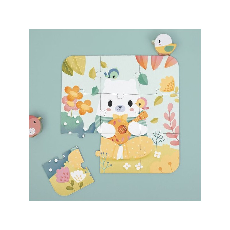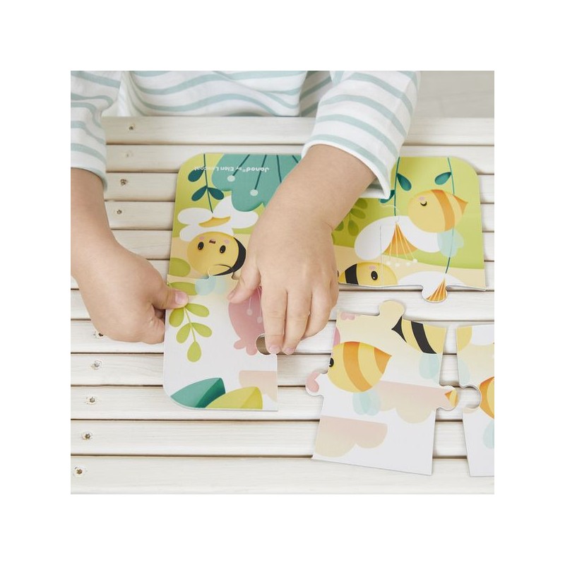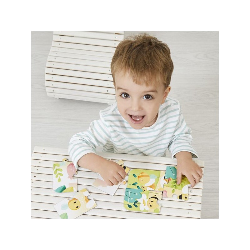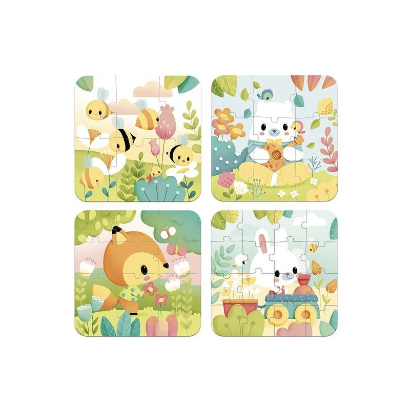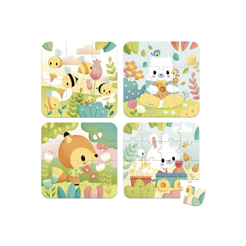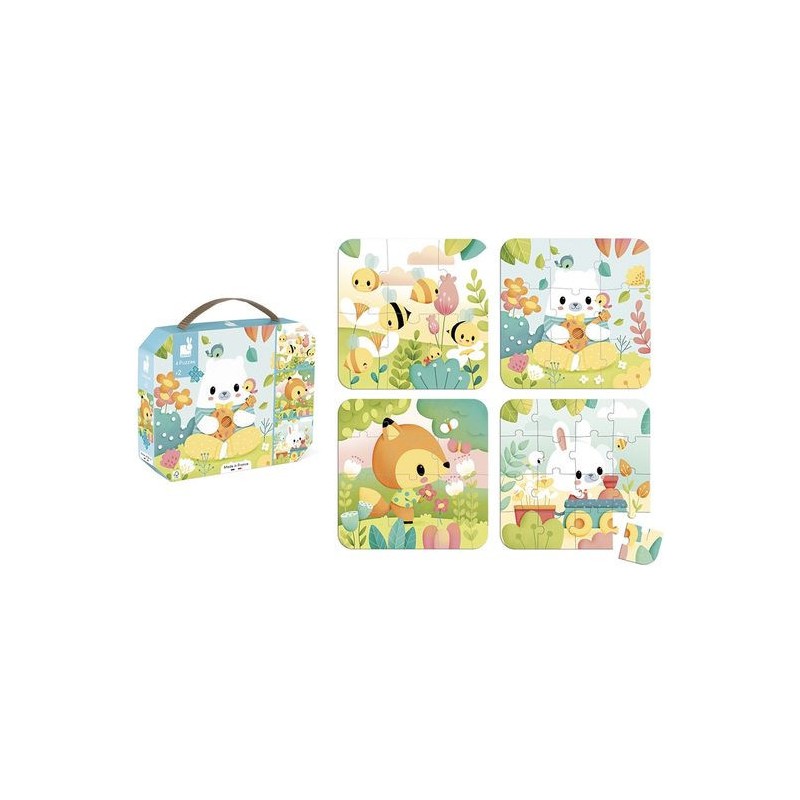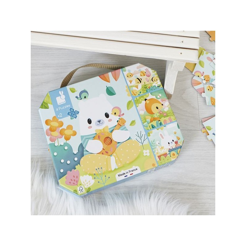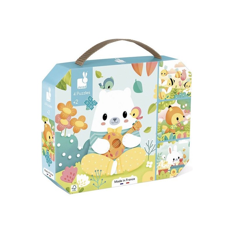Les premiers puzzles des tout-petits, idéals pour progresser ! Avec ces 4 puzzles évolutifs décorés d’adorables petits animaux, les enfants dès 2 ans découvrent les casse-têtes à leur rythme. Chaque puzzle, composé de 6, 9, 12 et 16 pièces, accompagne l’enfant dans sa progression, et stimule ainsi sa motricité fine et sa concentration. Un défi adapté à chaque étape de son apprentissage ! Chaque puzzle possède une couleur différente au dos, ce qui aide l’enfant à identifier facilement les 4 puzzles. De plus, les grosses pièces sont parfaitement adaptées aux petites mains, et rendent l’expérience de jeu à la fois amusante et agréable. C'est un voyage ludique à travers les puzzles : les bambins débutent leur découverte de ces jeux reconnus pour favoriser la logique et la dextérité, accompagnés d’adorables illustrations ! C’est une excellente façon de combiner jeu et apprentissage. Pratique, ces puzzles animaux sont rangés dans une valisette avec une poignée, ce qui permet à votre enfant de les emporter partout. Que ce soit en voyage ou lors d’une visite chez ses grands-parents, votre petit pourra emmener avec lui cette activité calme et stimulante. Alors, êtes-vous prêt à craquer pour ces petites abeilles, ce petit renard ou cet ourson musicien avec notre lot de 4 puzzles ? Ils sont fabriqués en France, décorés avec des encres végétales et composés de carton Fsc™.