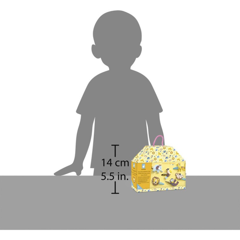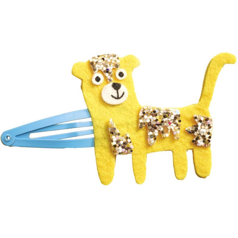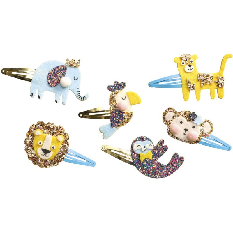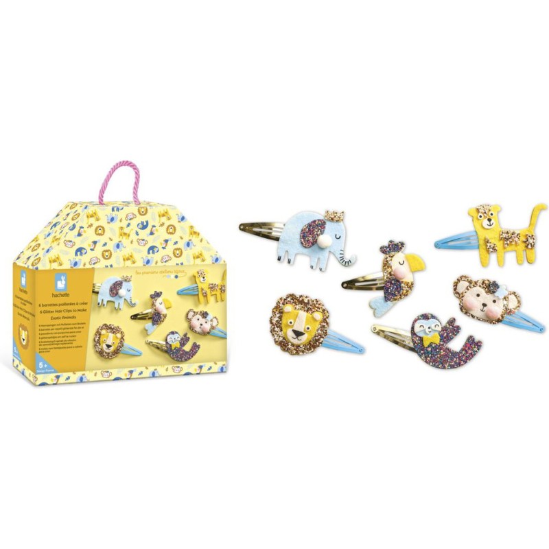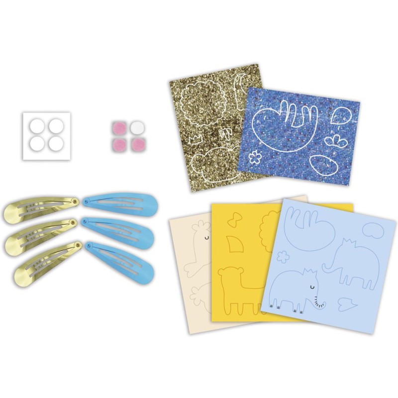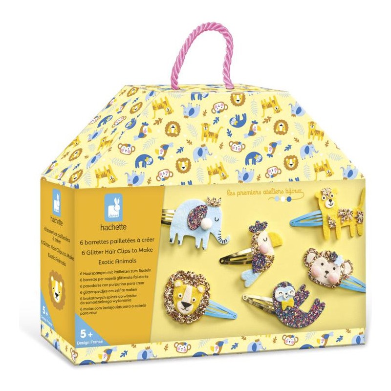 Ajoute une touche de style à ta coiffure avec ce kit créatif permettant de créer 6 barrettes animaux à paillettes ! Mignons, mais aussi funs et brillants : tout ce qu'aiment les enfants à partir de 5 ans. Ce set propose aux petits artistes de réaliser et de porter ensuite leurs créations ! Il suffit d'un peu de patience et de minutie pour réaliser facilement ses propres accessoires, et porter fièrement : un éléphant, un lion, un léopard, un toucan, un paresseux et un singe. Ce coffret contient : 6 barrettes de 5 cm, 3 planches de feutrine prédécoupée et autocollante, 2 planches de matière pailletée prédécoupée et autocollante, 4 pompons, des pastilles autocollantes double-face. Pas besoin de colle ! Un livret est aussi inclus, avec toutes les instructions et les modèles à reproduire avec le contenu du kit. Au total, il faudra compter 10 minutes pour réaliser une barrette, soit environ 1 heure pour créer les 6. Grâce à leur concentration et leur dextérité, les fans de bijoux et d'accessoires seront ravis de créer eux-mêmes leurs petits trésors. Voilà un loisir créatif ludique qui satisfera les amateurs de Diy ! Son plus ? La jolie boîte imprimée qui prend la forme d’un petit sac à transporter partout ! Ce kit créatif Barrettes Exotic Animals à créer est issu de la collection les Ateliers Bijoux.