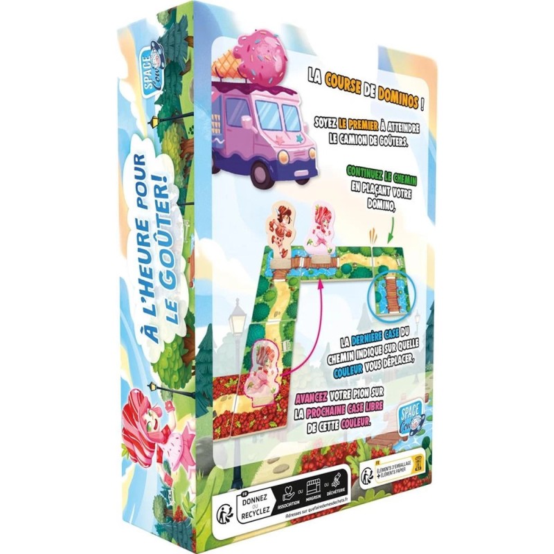 Dans le jeu À l’heure pour le goûter, les enfants se lancent dans une course gourmande pour être les premiers à atteindre le camion de glace. Pour avancer, il faut construire une route en posant des dominos colorés et guider son pion jusqu’au bout du chemin.