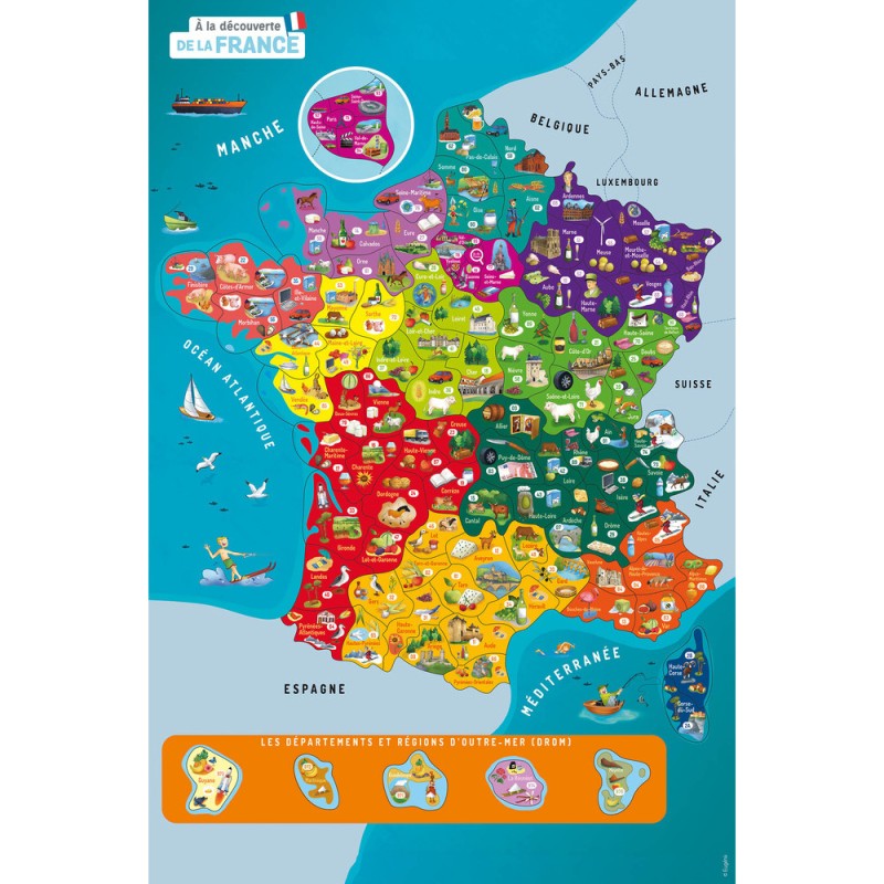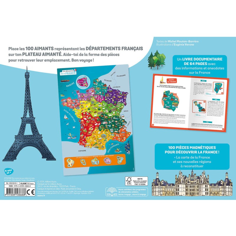 La boîte comprend un livre documentaire de 64 pages pour tout savoir sur la France, ainsi que 100 aimants à replacer sur un grand plateau aimanté.