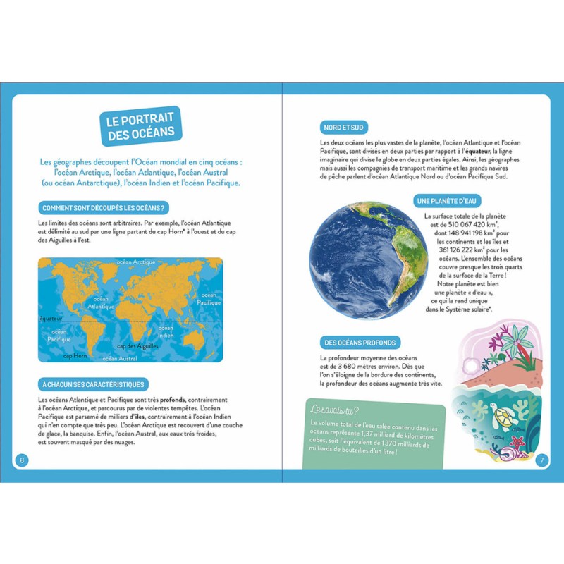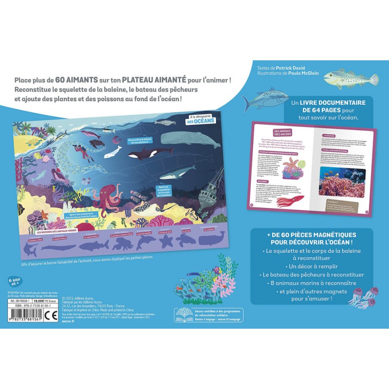 La boîte comprend un livre documentaire de 64 pages pour tout savoir sur les océans, ainsi que + de 60 aimants à replacer sur un grand plateau aimanté.