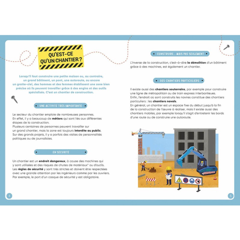 La boîte comprend un livre documentaire de 64 pages pour tout savoir sur les chantiers, ainsi que + de 50 aimants à replacer sur un grand plateau aimanté.