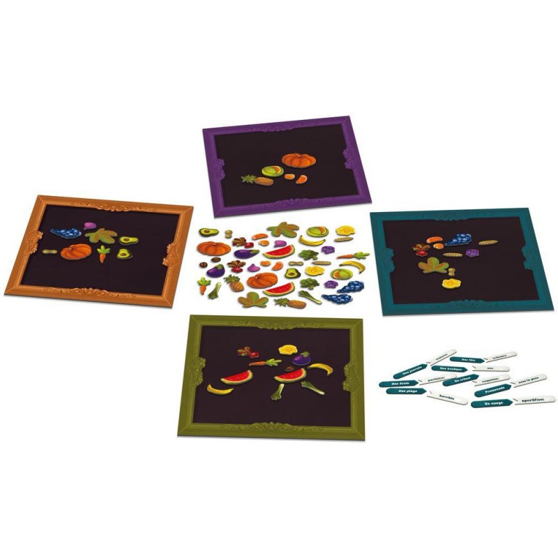Les joueurs vont créer des œuvres à l’aide des éléments magnétiques, fruits, légumes, céréales et fleurs. Dès qu’un joueur a terminé son œuvre, il pivote son plateau cadre afin que les autres joueurs puissent la visualiser dans le bon sens. Il est temps pour chacun de commenter son œuvre en quelques mots en commençant par le Maître Arcimboldo, puis chaque joueur dans le sens des aiguilles d’une montre.