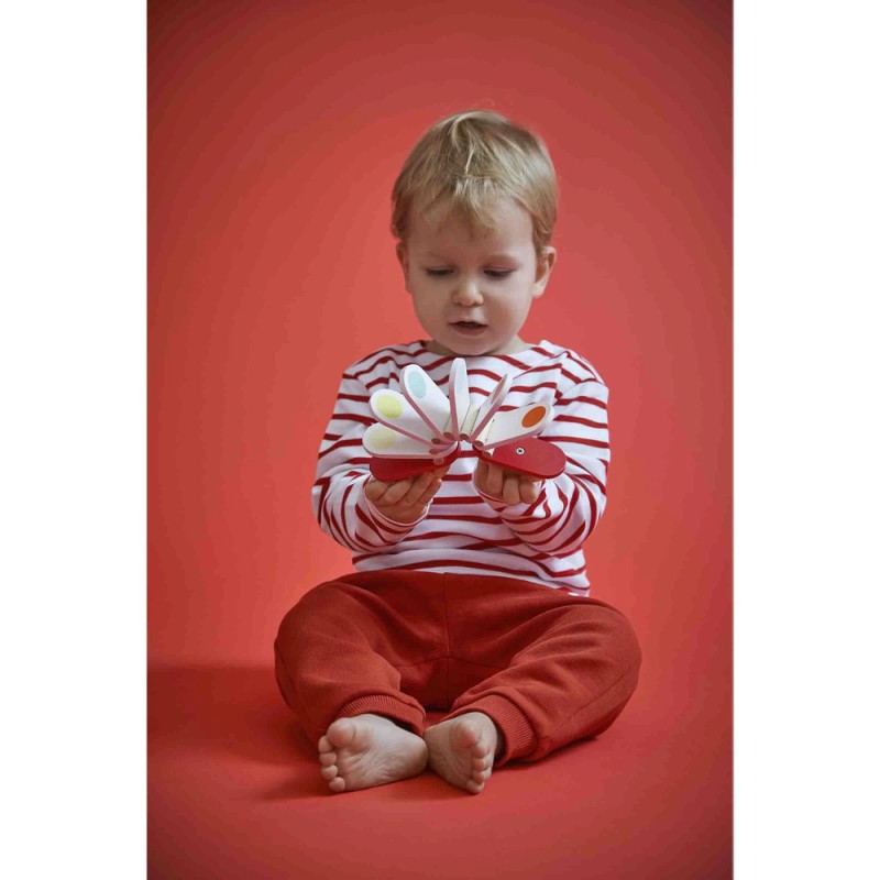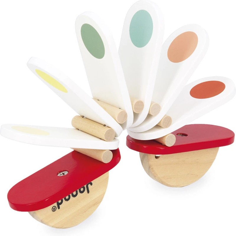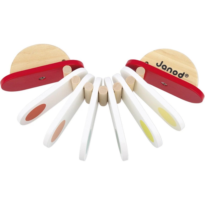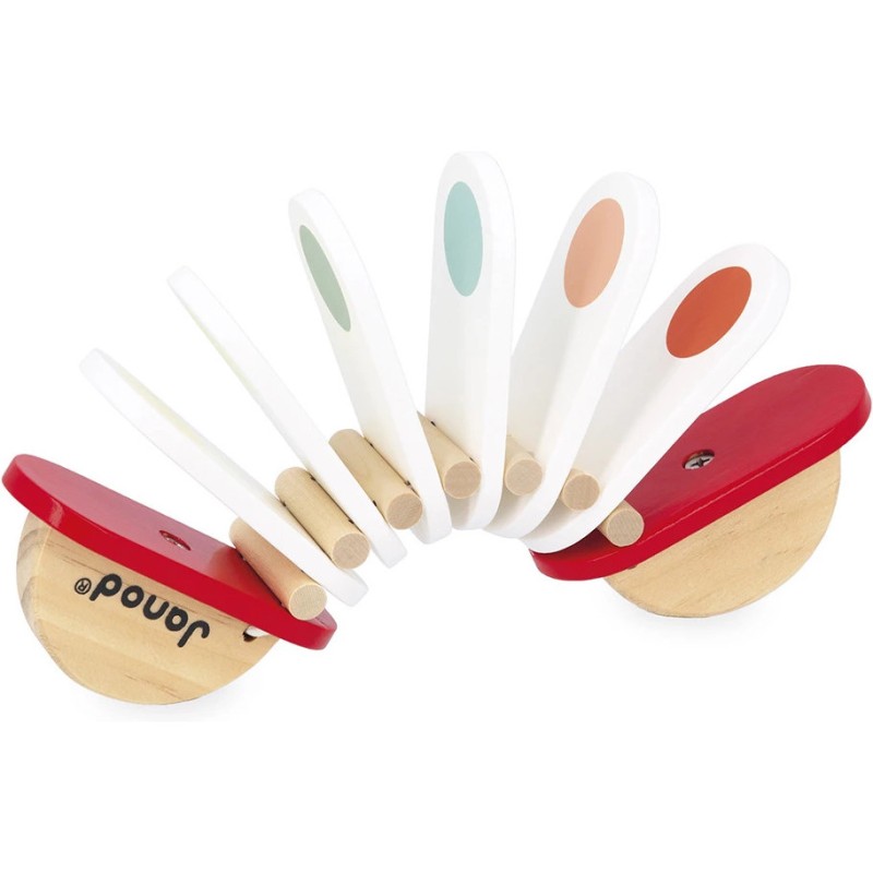 Clac, clac… le rythme s’invite à la maison ! Ce joli clac-clac en bois en forme d'accordéon va amuser les tout-petits dès 18 mois. Pour l’utiliser, il suffit de tenir les deux parties en bois et de les faire basculer d’avant en arrière : les lames blanches s’entrechoquent et produisent un son sec et rigolo, comme un petit applaudissement joyeux ! Avec ses couleurs vives et son format pratique, il se glisse facilement dans les petites mains. Ce jouet d’éveil musical est idéal pour développer la motricité, la coordination et initier les enfants aux plaisirs du rythme, tout en les invitant à s’essayer à l’improvisation musicale. Ce clac clac fait partie de la gamme Confetti, une gamme complète de jouets instruments de musique avec des motifs Pop N' Rock ! Plein de couleurs et de joie, les jouets musicaux Confetti permettent aux plus jeunes musiciens de s'initier aux joies de l'improvisation musicale. Ce jouet d'éveil musical est fabriqué à partir de bois Fsc™.