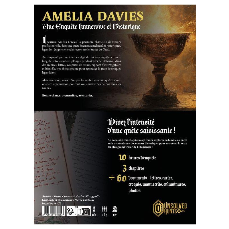 Entrez dans la peau d’Amelia Davis, la première chasseuse de trésors privée, et plongez dans une quête palpitante à travers trois chapitres captivants. Plongez vous dans l'Histoire, explorez des lieux mystérieux et déjouez une organisation secrète pour découvrir le Graal.