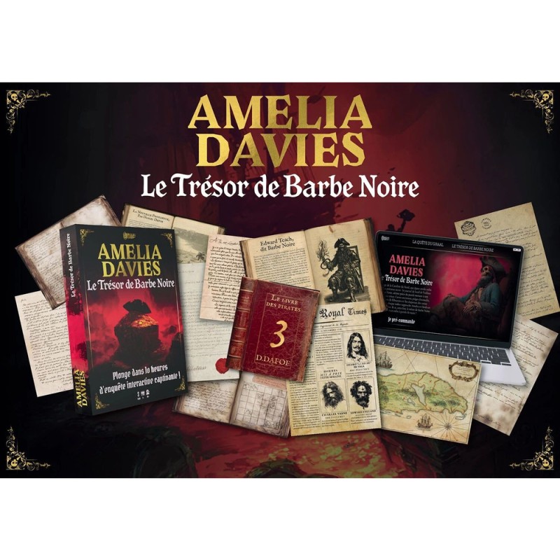 Contenu : Amelia Davis contient :, Plus de 60 documents (journal de bord, archives historiques, cartes anciennes…), 3 chapitres de jeu contenus dans 3 enveloppe de Jeu, Une boite rigide entourant le jeu, 1 notice de présentation du jeu