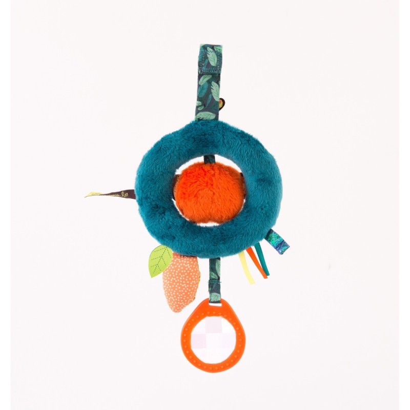 L'anneau d'activités aux motifs feuilles comporte un prisme avec deux perles le long de son cordon, des petits gris-gris et feuilles pour amuser bébé. Au centre, un petit poussin au pelage orange déjanté est bien installé, comme sur une balançoire.