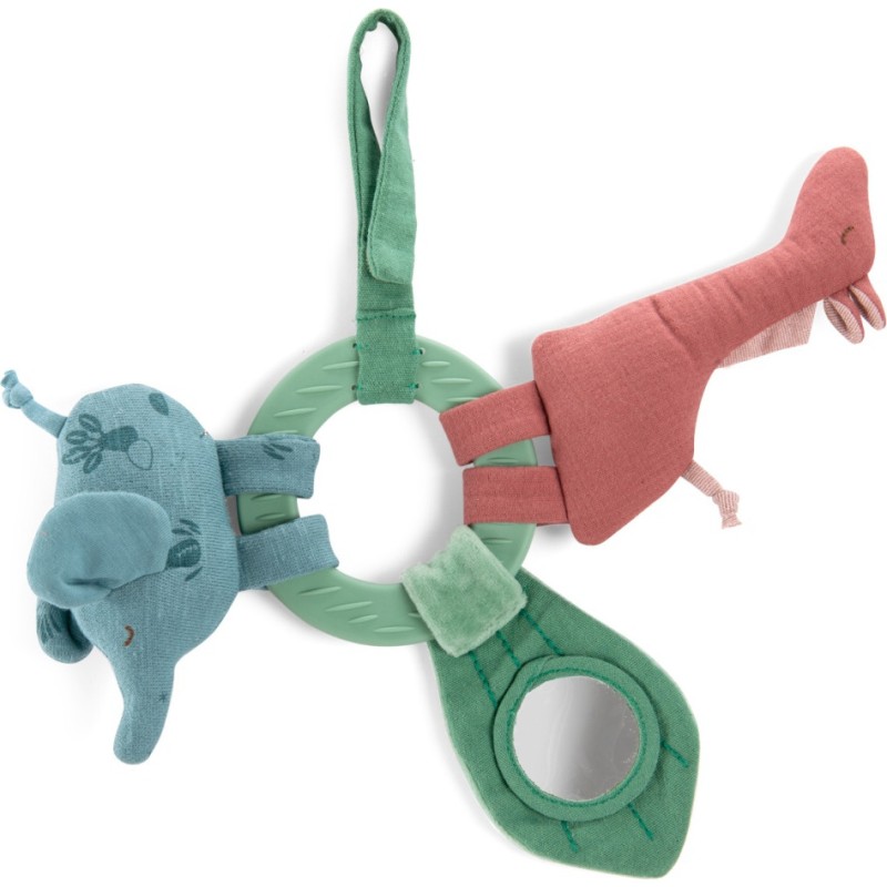 L'anneau aux couleurs de la savane comporte un pouët caché dans le ventre de Bergamote l'éléphant, un grelot dans celui de Bibiscus la girafe, tout plein de surprises à toucher et attraper! Pratique avec le velcro, on peut le suspendre et l'emmener partoutSous mon Baobab haut comme le ciel, la savane s’éveille… Suivez Paprika le lion, Bibiscus la girafe et Bergamote l’éléphant au cœur d’une collection particulièrement destinée aux cadeaux de naissance.