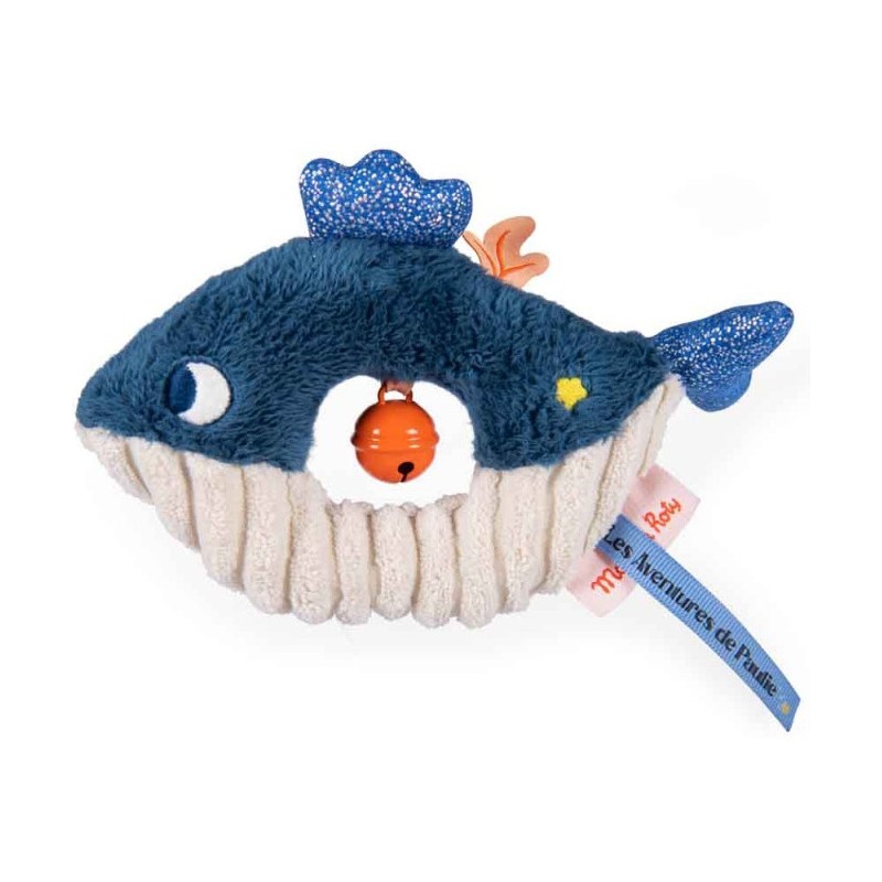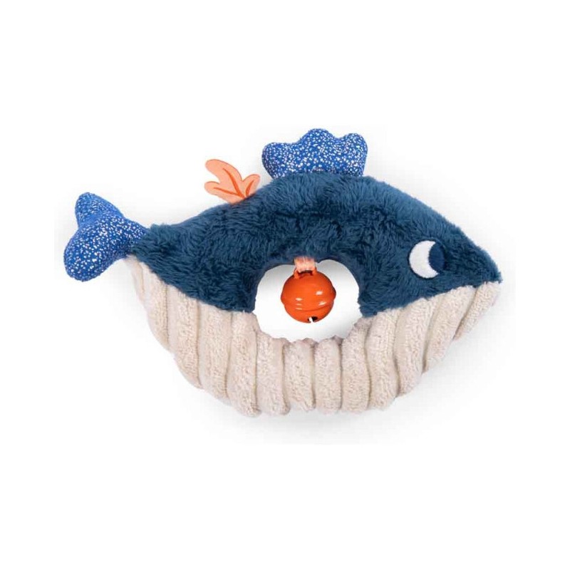 Une petite baleine que l'on entend tinter ! Cet anneau hochet facile à attraper est paré de trois tissus aux couleurs contrastées : tout doux, côtelé et pailleté. Le grelot couleur corail amusera bébé qu'il soit à la maison ou en promenade.