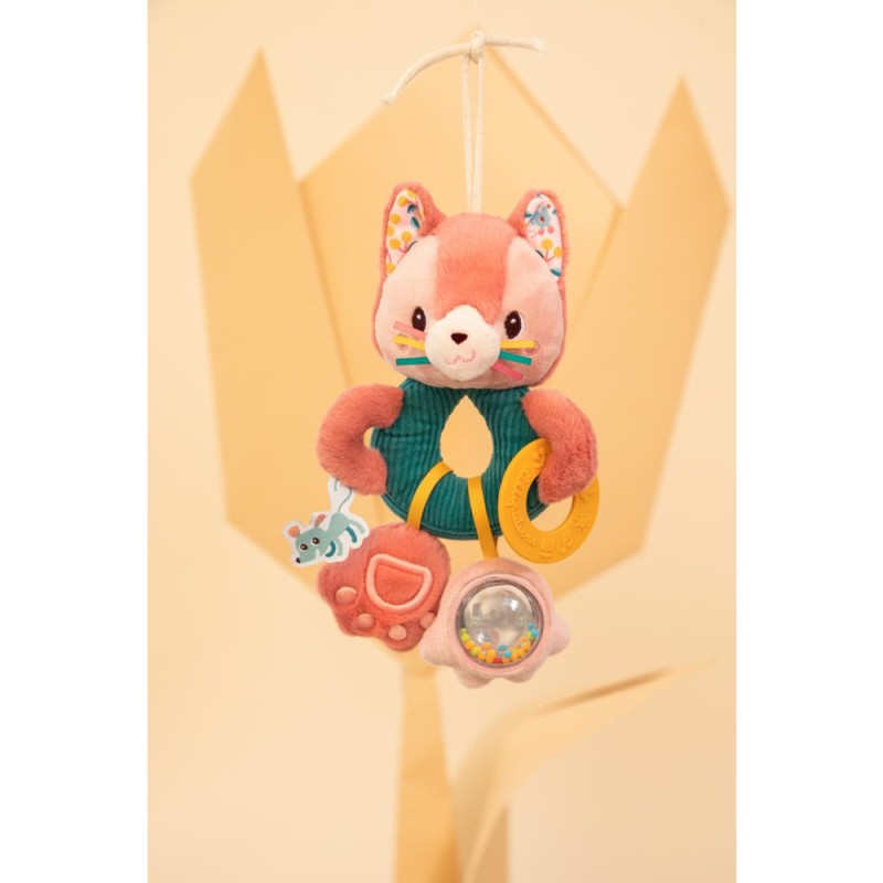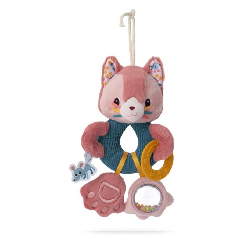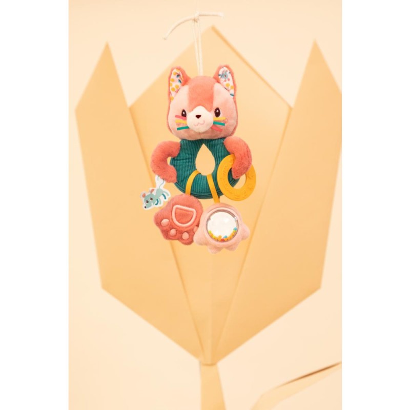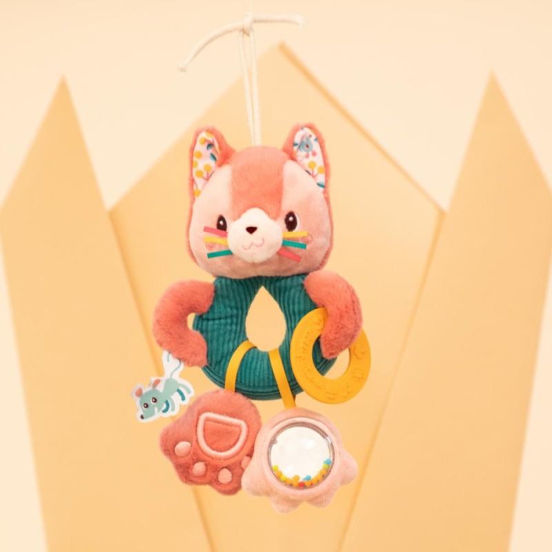 Un jouet d'activités sans compromis ! Dans sa version anneaux multiactivités, Jeanne le chat stimule les sens de bébé dès ses 3 mois. Cet adorable petit chat rose propose 4 activités d'éveil, facilement à portée de mains des petits. A commencer par son adorable frimousse, contenant du papier bruissant à faire crépiter encore et encore ! Bébé dispose aussi d'un anneau de dentition jaune en silicone, qu'il peut mordiller à sa guise pour soulager ses gencives quand ses petites dents poussent. Ensuite, l'une des pattes de notre félin est un chouette hochet à billes aussi agréable à observer qu'à faire tinter. Pour finir, la seconde patte de Jeanne est toute douce et fait "pouet" lorsqu'on appuie dessus. Voilà de quoi développer les capacités motrices et cognitives de bébé, tout en douceur ! C'est un jouet d'éveil à suspendre très pratique pour divertir bébé dans son cosy ou dans son parc, par exemple. La touche Lilliputiens : les rubans, étiquettes, textures et motifs captivants qui reflètent la personnalité de Jeanne. Elle aime passer du temps dans le jardin, et ses amies souris ne sont jamais bien loin ! Ce jouet multiactivités stimule la vue, l'ouïe et le toucher de bébé. Avec lui, il développe sa curiosité et apprend par la manipulation. Offrez dès maintenant ce jouet premier âge comme cadeau de naissance ! Dans son format 16x24 cm, cet anneau multiactivités est lavable à la main en surface uniquement.