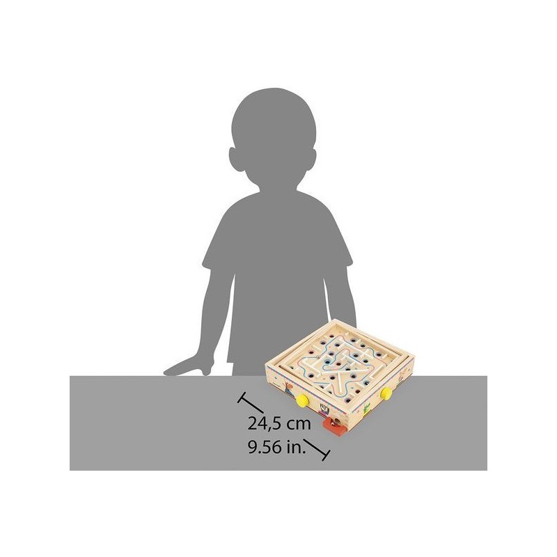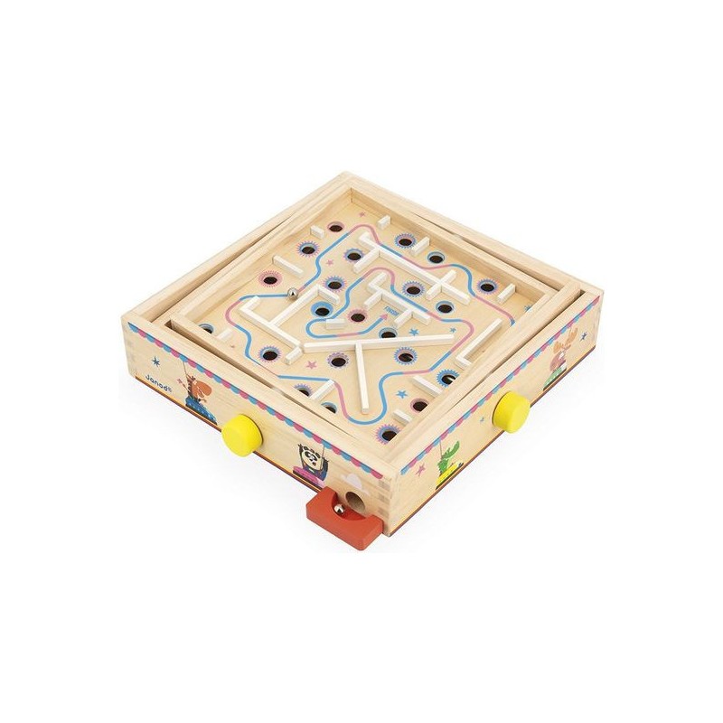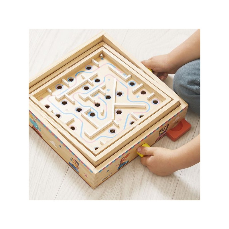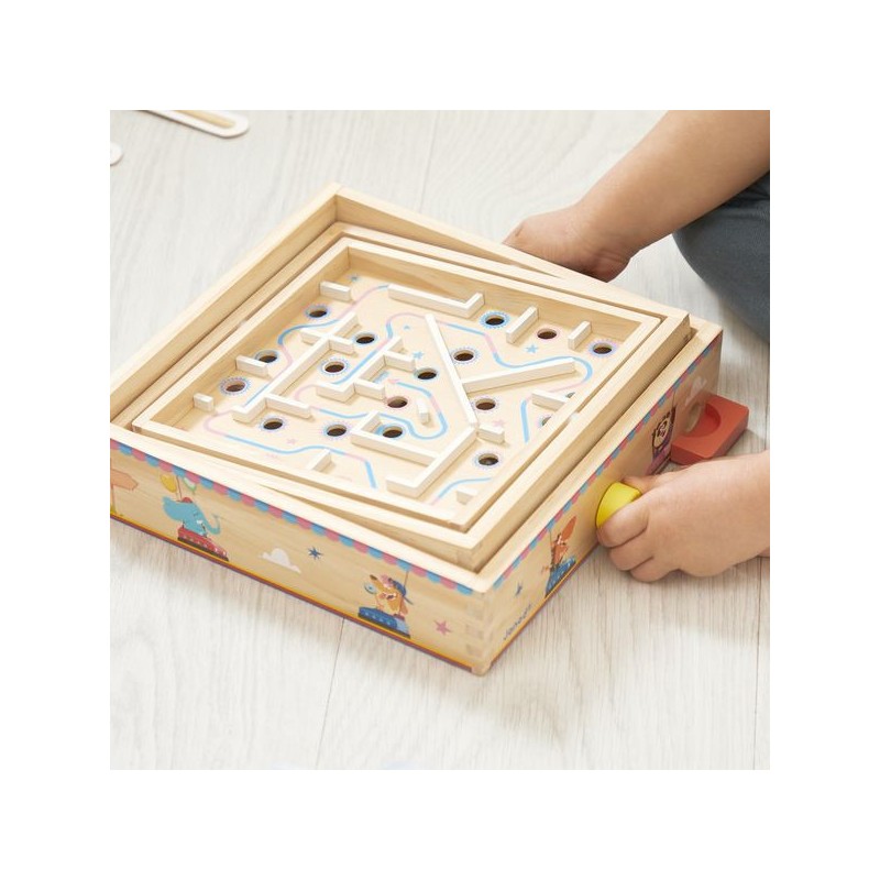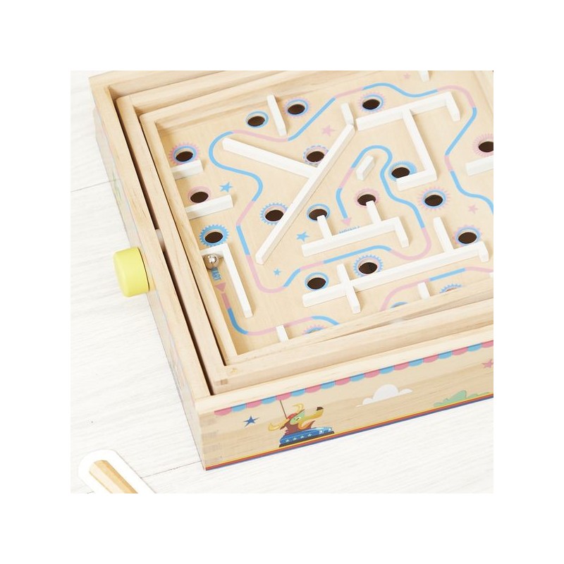 Viendrez-vous à bout de ce labyrinthe ? Pensé pour les enfants à partir de 5 ans, ce jeu d’adresse en bois va faire tourner les têtes ! L’objectif de ce labyrinthe à bille est simple : faire pivoter le plateau central sur deux axes grâce aux boutons rotatifs pour faire rouler la bille sur le parcours … Semé d’embuches ! Il s’agit d’éviter les trous et d’anticiper le mouvement de la bille pour atteindre l’arrivée. Parfait pour développer la concentration, la coordination, l’adresse, mais aussi la patience des petits ! Car il faudra persévérer pour devenir un grand maître du labyrinthe : de quoi rester occupé pendant de longs moments. Amusant et ingénieux, ce jeu d’adresse est orné d’illustrations festives sur le thème de la fête foraine. Tout autour du plateau, des animaux rigolos s’éclatent aux auto-tamponneuses, tandis que l’intérieur du parcours de bille nous fait plutôt penser au Palais des glaces. Pour guider les enfants, le chemin du départ à l’arrivée est indiqué par une flèche colorée. Si votre bille tombe dans un trou, pas de panique, elle ressortira dans le bac rouge à l’extérieur du support. Livré avec 2 billes en métal, ce labyrinthe est l’occasion parfaite de réunir la famille ou les copains pour se lancer des défis tour à tour ! Animez vos soirées jeux en relevant le défi ! Ce jeu de kermesse est composé de bois issu de forêts gérées durablement, certifié Fsc™. Il fait partie de la grande collection Applepop, une collection de jeux funs et décalés inspirée de l’univers de la fête foraine. Alors, ne perdez pas la boule !