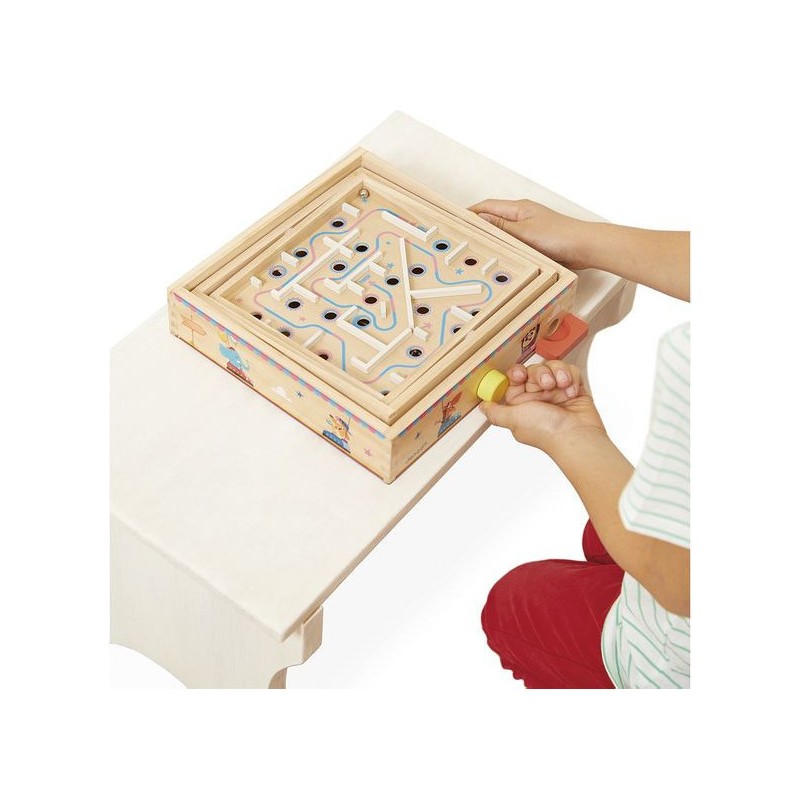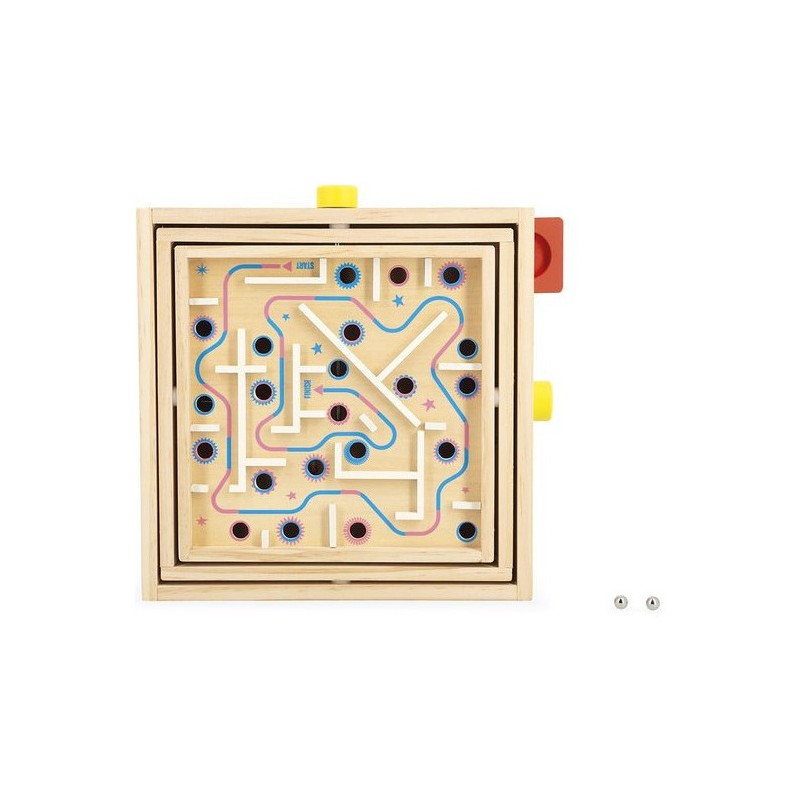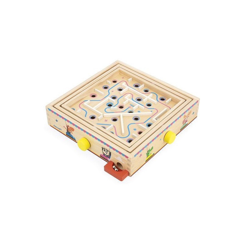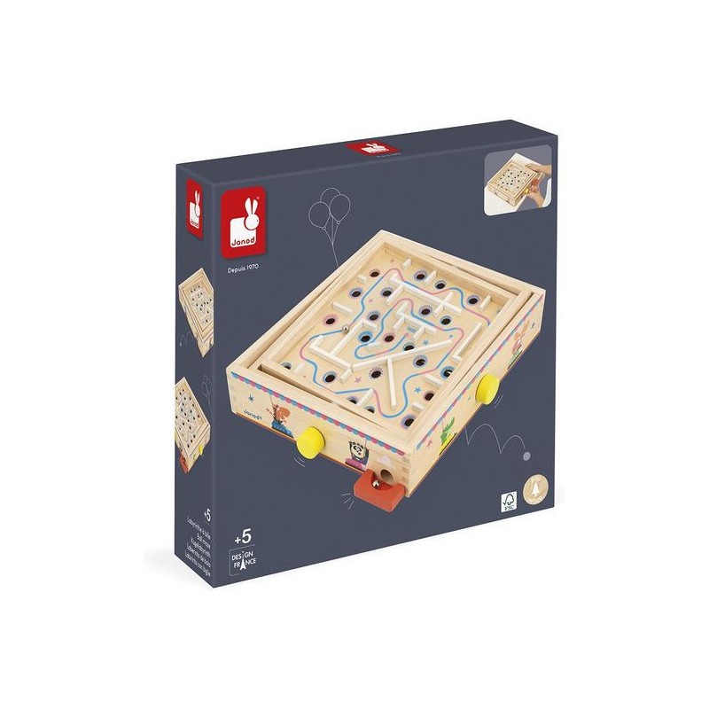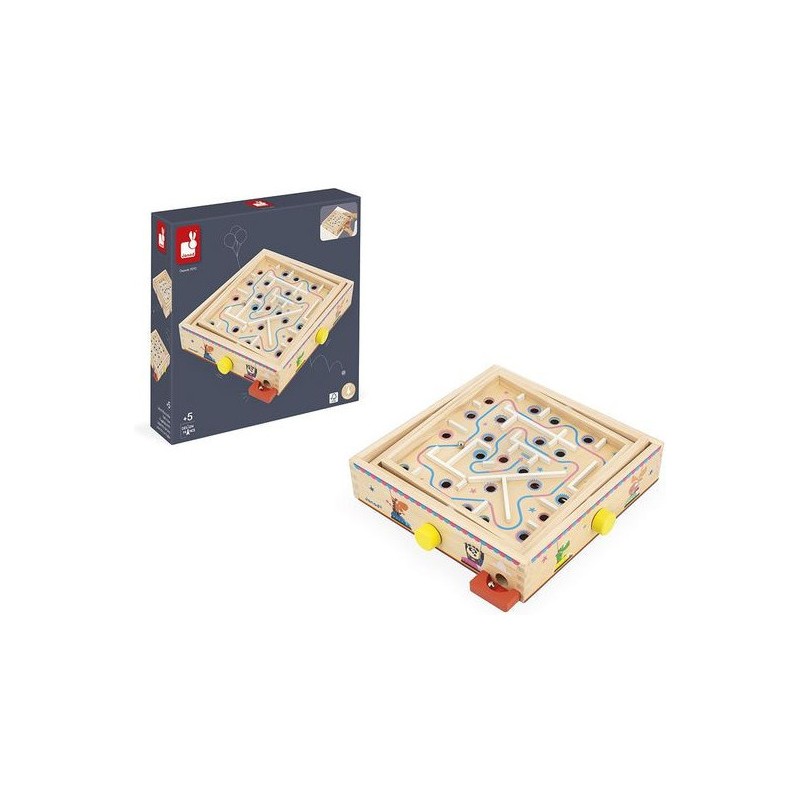 Viendrez-vous à bout de ce labyrinthe ? Pensé pour les enfants à partir de 5 ans, ce jeu d’adresse en bois va faire tourner les têtes ! L’objectif de ce labyrinthe à bille est simple : faire pivoter le plateau central sur deux axes grâce aux boutons rotatifs pour faire rouler la bille sur le parcours … Semé d’embuches ! Il s’agit d’éviter les trous et d’anticiper le mouvement de la bille pour atteindre l’arrivée. Parfait pour développer la concentration, la coordination, l’adresse, mais aussi la patience des petits ! Car il faudra persévérer pour devenir un grand maître du labyrinthe : de quoi rester occupé pendant de longs moments. Amusant et ingénieux, ce jeu d’adresse est orné d’illustrations festives sur le thème de la fête foraine. Tout autour du plateau, des animaux rigolos s’éclatent aux auto-tamponneuses, tandis que l’intérieur du parcours de bille nous fait plutôt penser au Palais des glaces. Pour guider les enfants, le chemin du départ à l’arrivée est indiqué par une flèche colorée. Si votre bille tombe dans un trou, pas de panique, elle ressortira dans le bac rouge à l’extérieur du support. Livré avec 2 billes en métal, ce labyrinthe est l’occasion parfaite de réunir la famille ou les copains pour se lancer des défis tour à tour ! Animez vos soirées jeux en relevant le défi ! Ce jeu de kermesse est composé de bois issu de forêts gérées durablement, certifié Fsc™. Il fait partie de la grande collection Applepop, une collection de jeux funs et décalés inspirée de l’univers de la fête foraine. Alors, ne perdez pas la boule !
