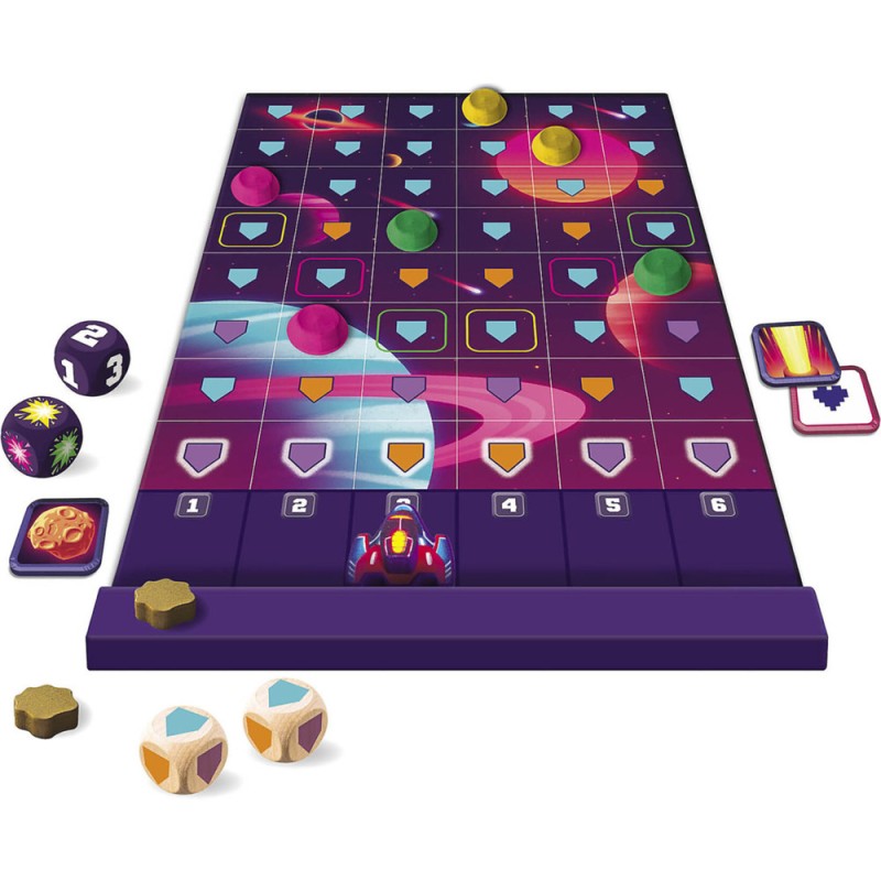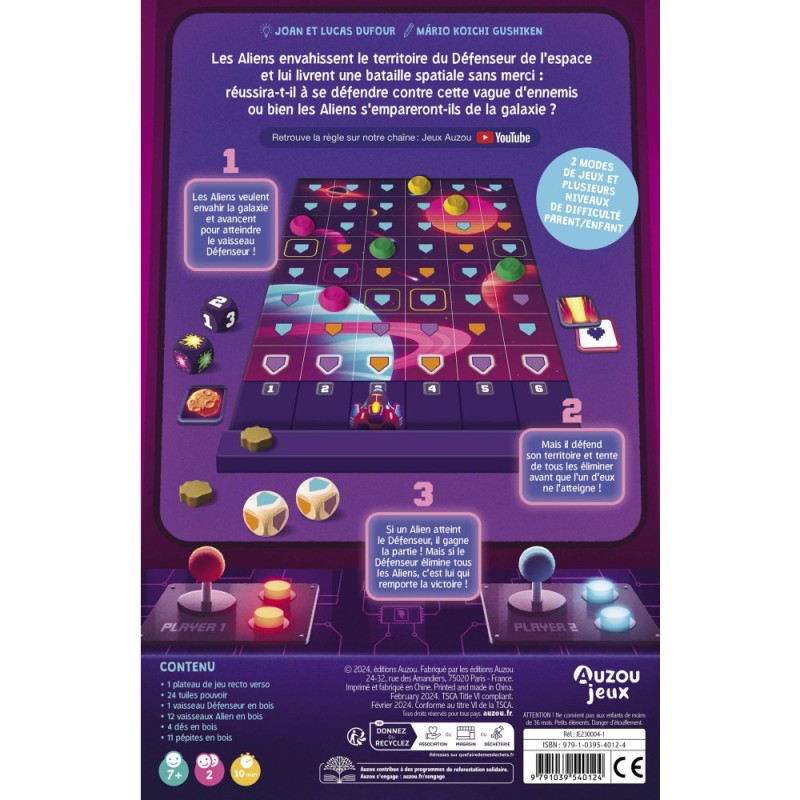 Contenu : 1 plateau de jeu recto verso / 24 tuiles pouvoir / 1 pion vaisseau défenseur en bois / 12 pions vaisseaux aliens en bois / 4 dés en bois / 11 pépites en bois