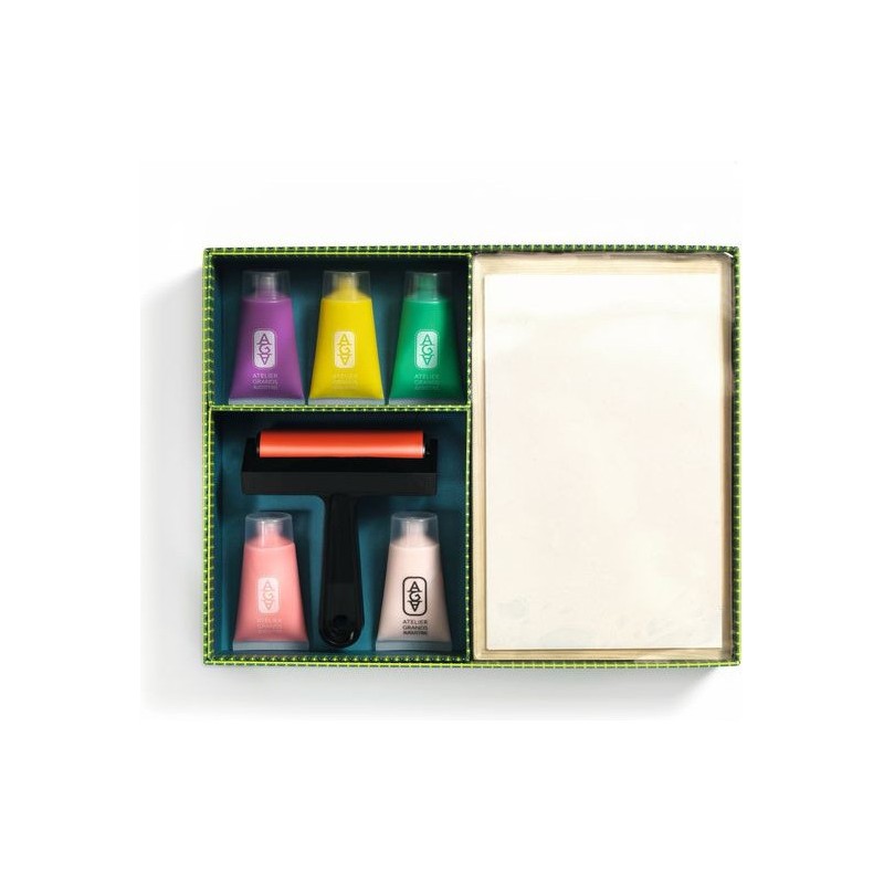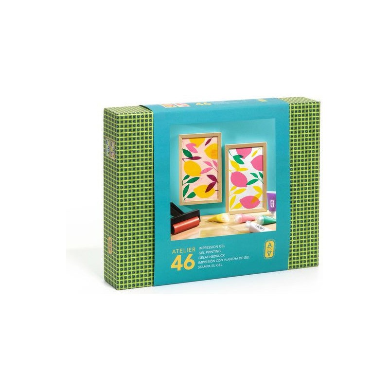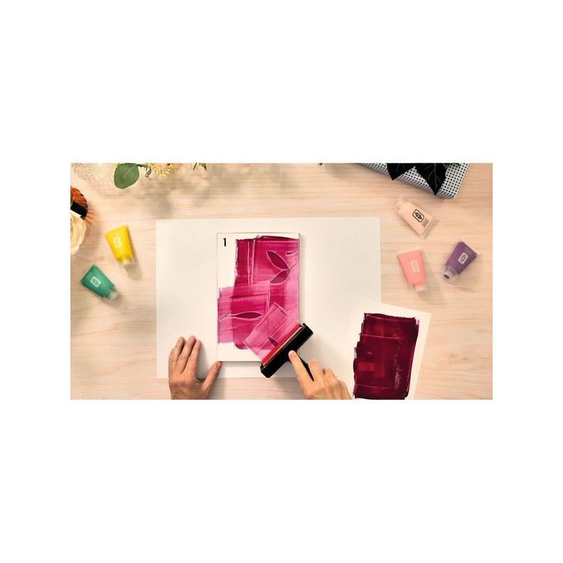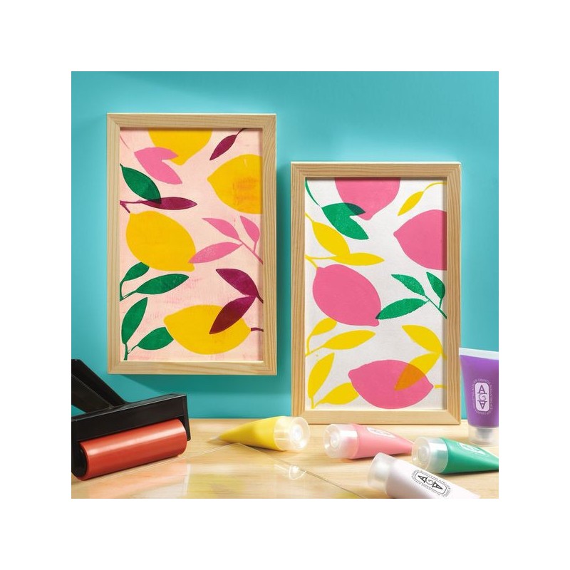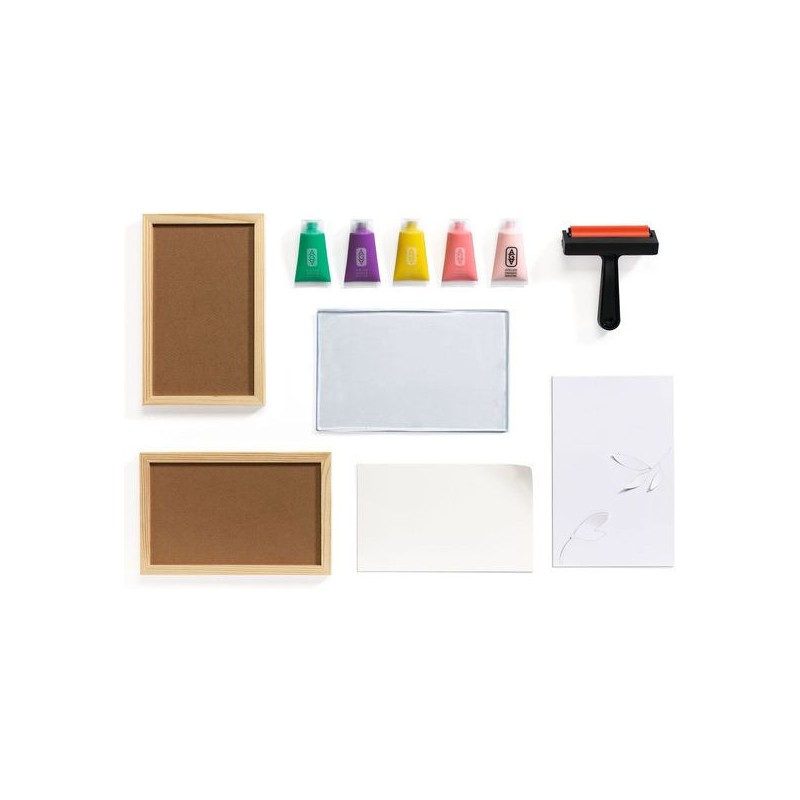 Contenu : 1 plaque de gel en silicone (format 235 x 150 mm) Un rouleau brayer 5 tubes de peinture 30 ml 10 papiers à imprimer 4 pochoirs indéchirables 2 cadres en bois Un dépliant et une carte avec QR code menant à une vidéo tuto pour découvrir l’activité