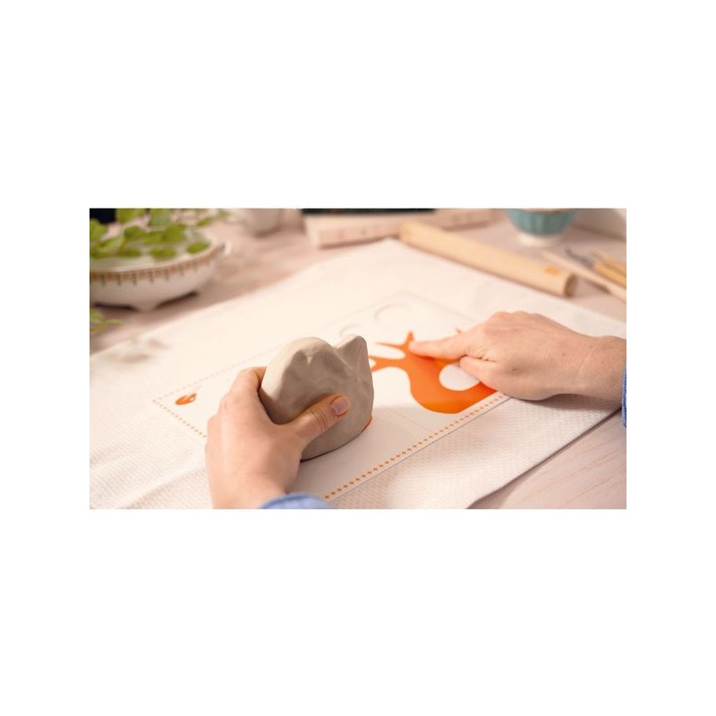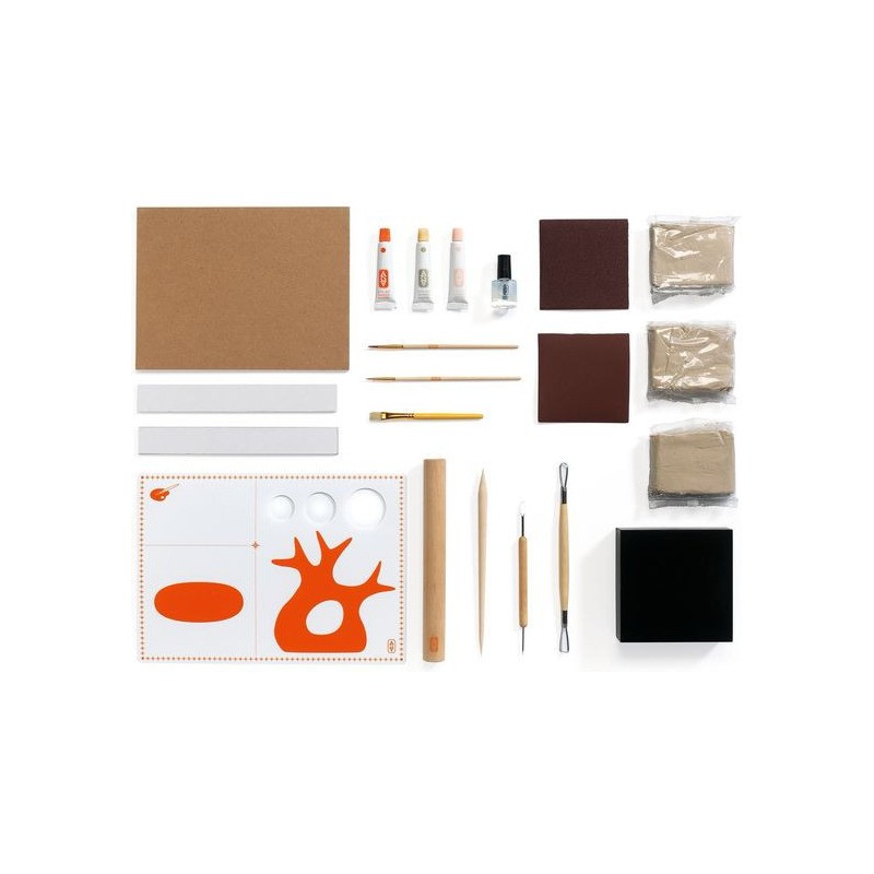 Contenu : 3 x 250 g de terre (argile) 4 outils 1 planche gabarit pour aider à appréhender les proportions 1 support de travail en bois 3 pinceaux 3 x 10 ml de peinture 1 x 10 ml de vernis 1 support de présentation peint en bois 1 modèle à suivre Un dépliant et une carte avec QR code menant à une vidéo tuto pour découvrir l’activité