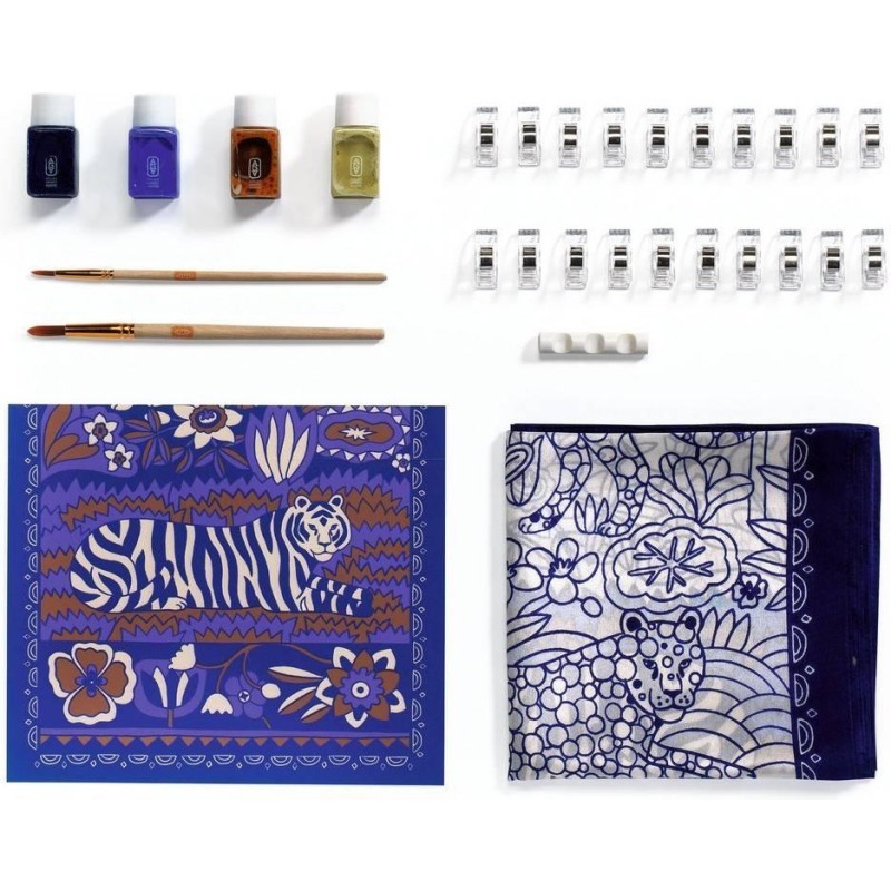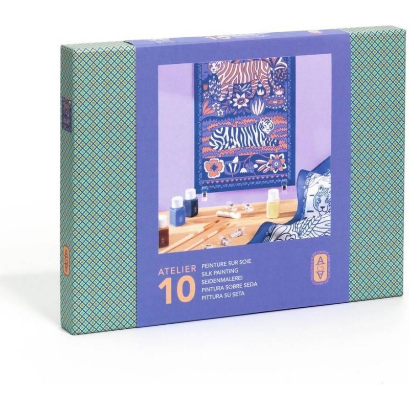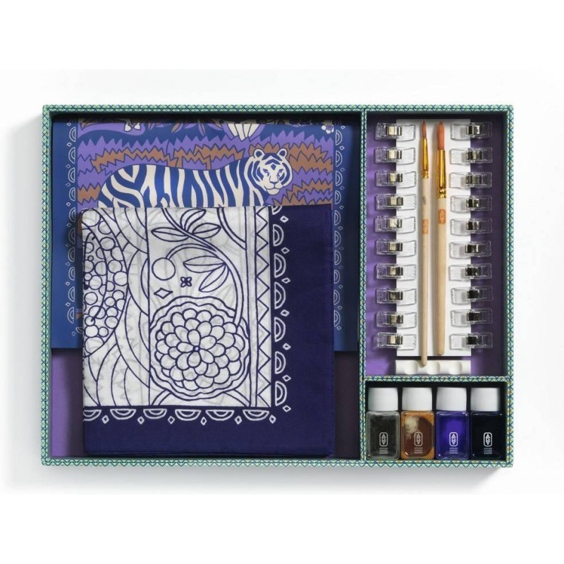 Contenu : avec la "gutta" déjà posée pour délimiter les motifs. 20 pinces à tissu 4 bouteilles x 30 ml de peinture sur soie 2 pinceaux 1 support pour pinceau 1 modèle à suivre Un dépliant et une carte avec QR code menant à une vidéo tuto pour découvrir l’activité