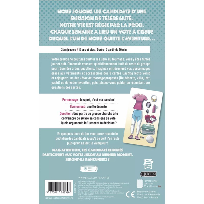Rassemblez quelques amis et inventez tous ensemble une histoire pleine de rebondissements, en toute simplicité. Rejoignez le tournage d'une émission de téléréalité. Choisissez l’un des 4 lieux proposés et l’un des 8 sets d'accessoires avec lequel vous avez rejoint l'aventure, et laissez-vous guider en répondant aux questions des cartes. En quelques tours de jeu, vous aurez raconté un récit mêlant situations cocasses, entraides et trahisons, jusqu’à ce que ce qu'il ne reste qu'un seul participant, le vainqueur. Mais attention, les joueurs éliminés participent aux votes jusqu'à la fin de la partie.