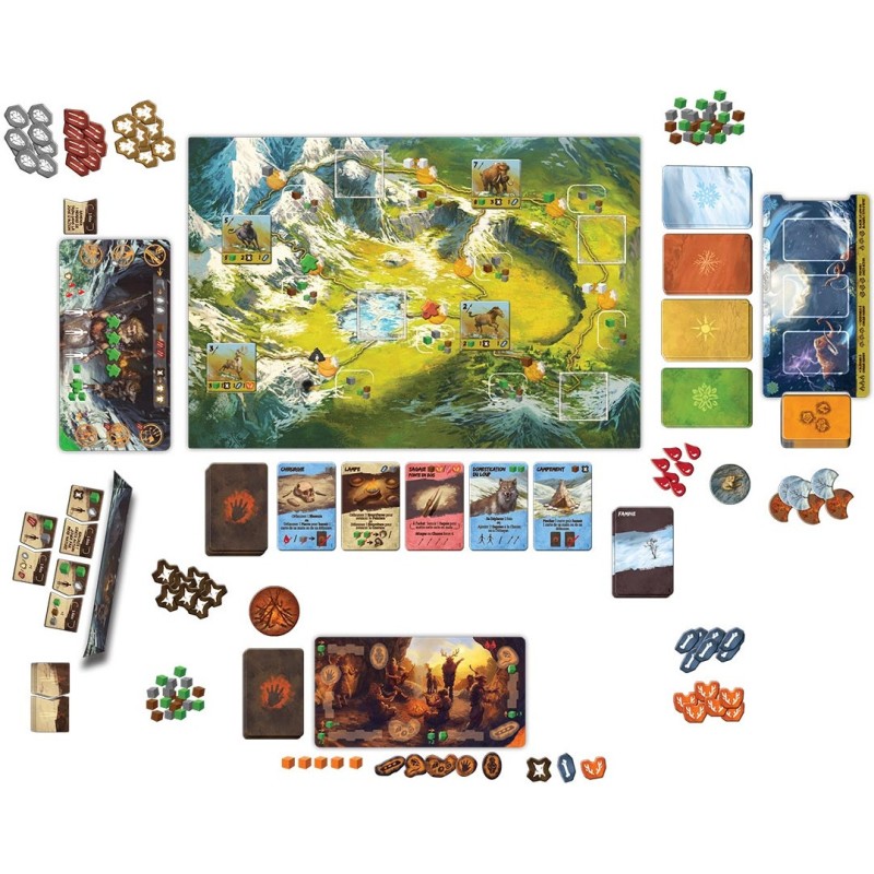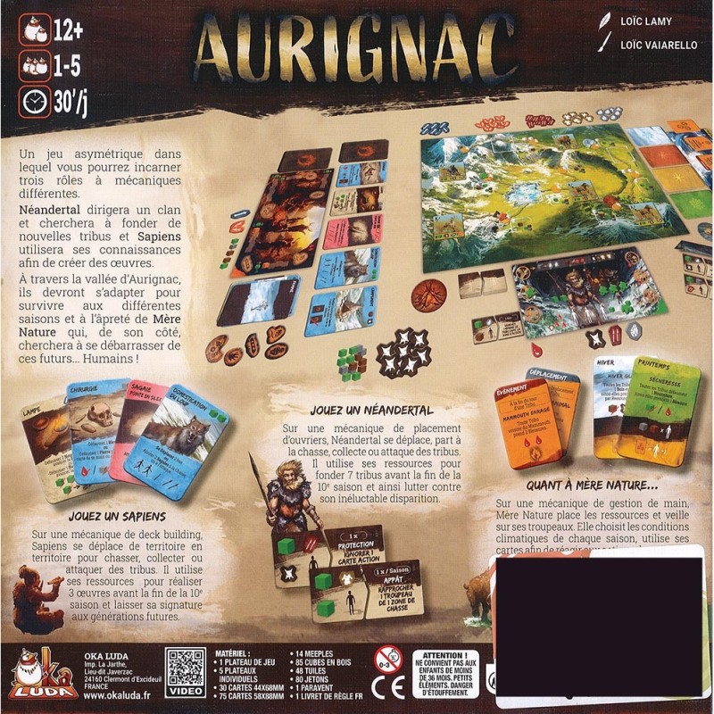 Aurignac est un jeu asymétrique, dans lequel vous dirigez un clan de Néandertaliens ou d’Homo-Sapiens. Une mécanique de deck building pour Sapiens, De placement d’ouvriers pour Neandertal et de Gestion de main pour Mère-Nature.