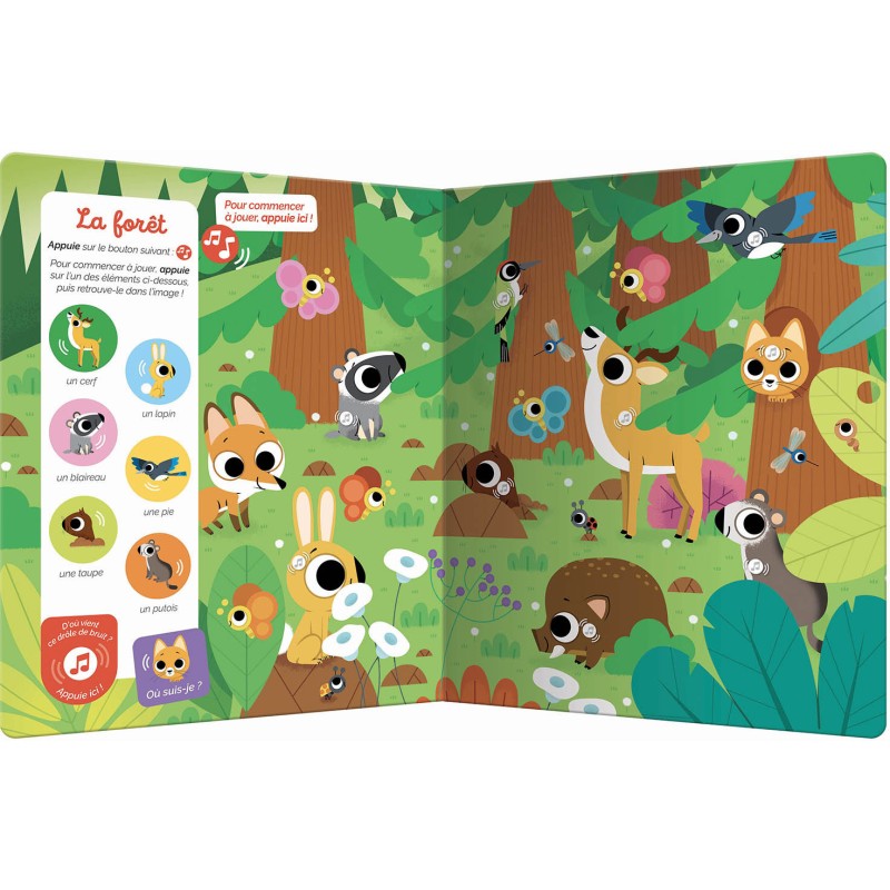 Sur chaque double-page, il observe et écoute attentivement pour retrouver 6 animaux et une mascotte qui se cache dans tous les univers : la ferme, la forêt, la savane, l'océan, la nuit...