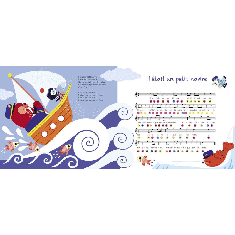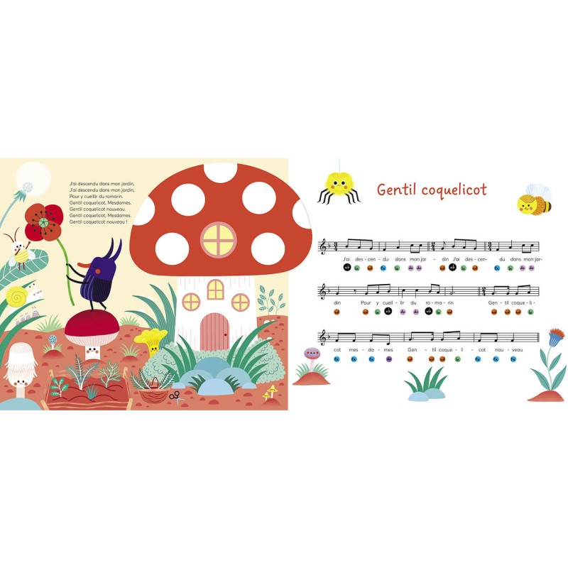 Sur la page de gauche, le texte de la comptine accompagné d'une illustration ; sur la page de droite, la portée musicale transpose les notes grâce à un code couleurs très simple.