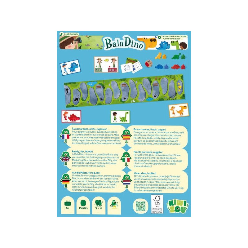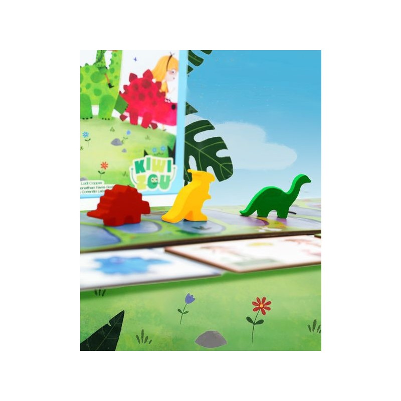 Une douce initiation à la prise de risque. Dans ce jeu de course original, les joueurs doivent gérer 2 pions : leur pion maitre et leur pion Dino. Pour gagner la partie, seul le pion Dino compte : le premier dino qui arrive à la fin du parcours remporte la course. Mais les joueurs devront aussi gérer leur pion maitre et le faire avancer. Si un pion Dino est trop éloigné de son pion maitre quand Billy la gardienne apparait, celui-ci doit retourner auprès de son maitre.
