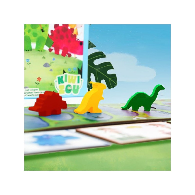 Contenu : Un plateau en trois parties, 4 cartes "duo" représentant les dinos et leur maître, Une carte Billy la gardienne, 6 cartes banc, 8 pions en bois (4 maîtres & 4 dino), Un dé en bois