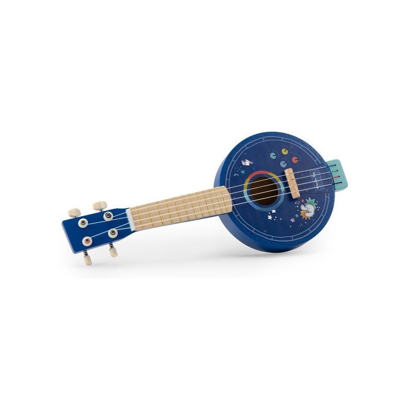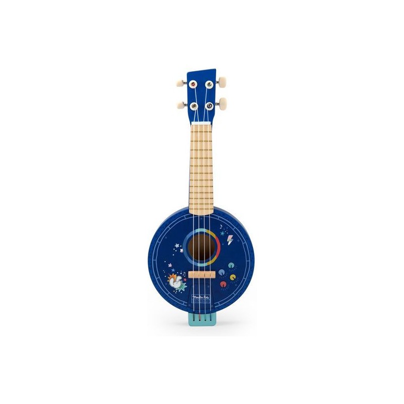 Banjo en bois à 4 cordes en métal pour nos apprentis musiciens. L'instrument est orné d'une peinture holographique bleue ponctuée des couleurs éclatantes de l'univers de Puce & Pilou. Fabriqué en bois, il est léger et de taille idéale pour les enfants.