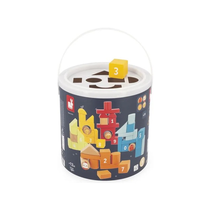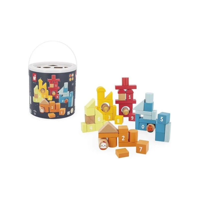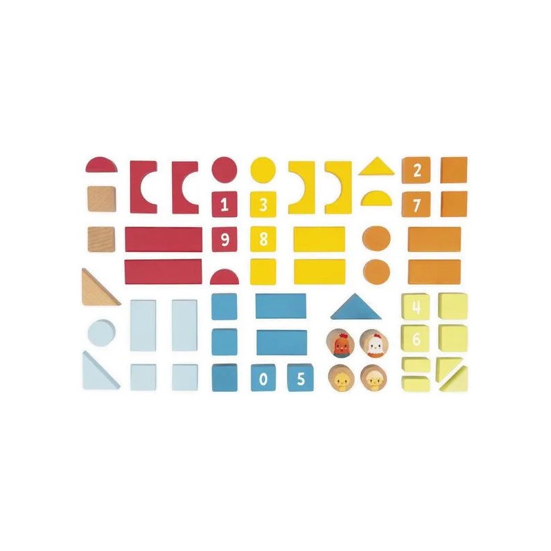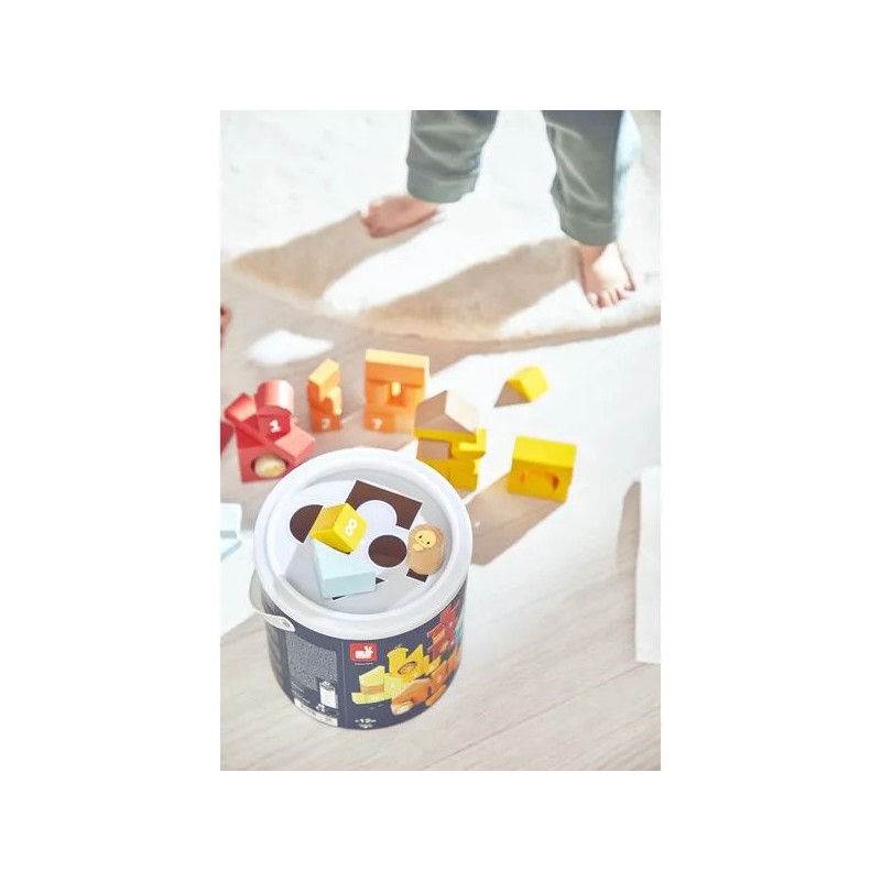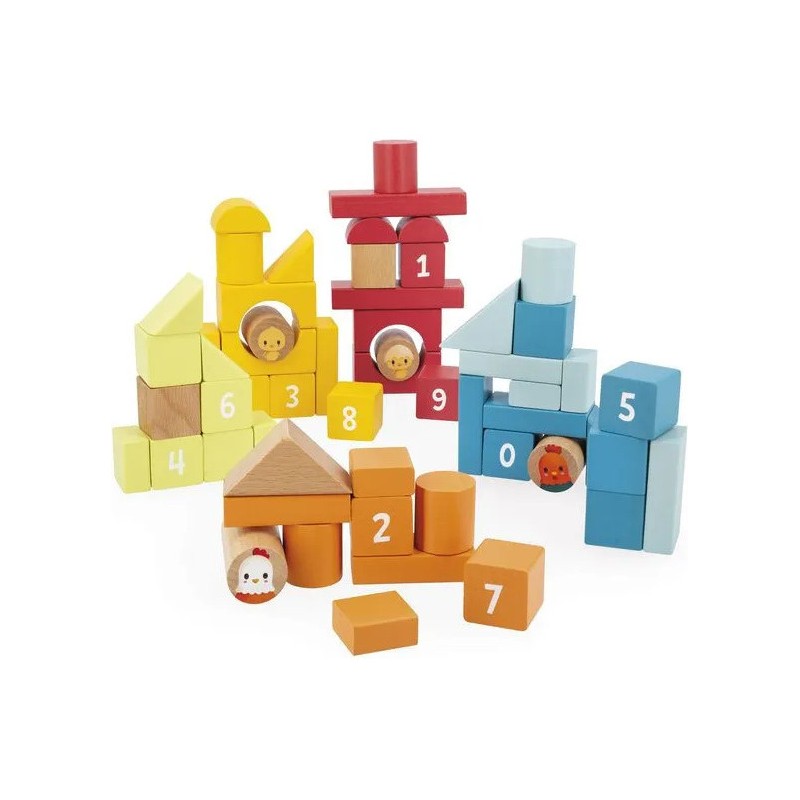 Bienvenue à la ferme des petits constructeurs ! Ce baril de 56 pièces sur le thème de la ferme permet aux enfants de créer leur propre univers fermier ! Ce jouet d'éveil stimule la motricité et l'imagination des tout-petits dès 12 mois. Ronds, carrés, triangles, ponts... les possibilités de constructions sont multiples... et parfois instables ! L’enfant empile les pièces et s'amuse à construire les éléments de sa ferme : granges, enclos ou poulaillers. Et parfois, tout tombe ! Mais que c'est rigolo ! Et puis c'est reparti pour un tour ! Ce jeu promet des heures d'amusement au autonomie ou avec des amis. Mais ce n’est pas tout : le baril cache aussi de jolies surprises ! Parmi les pièces se trouvent des illustrations d’animaux de la ferme: une poule, un coq et deux adorables poussins. C'est parfait pour inventer des histoires ! Ce jeu est également évolutif : il accompagne l’enfant dans ses apprentissages grâce à des cubes numérotés de 0 à 9 qui permettent de se familiariser avec les chiffres et d’apprendre à compter tout en s’amusant. Encore plus ludique, le baril fait aussi office de boîte à formes grâce à son couvercle découpé selon les formes des pièces. Les enfants apprennent à reconnaître les formes, à les manipuler et à les insérer au bon endroit. Livré avec un sac en coton, les pièces se rangent et se transportent facilement. Les pièces de construction sont fabriquées en bois Fsc™.
