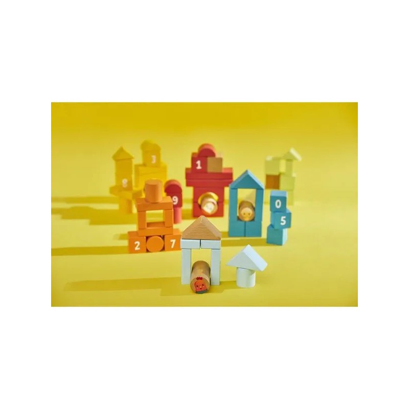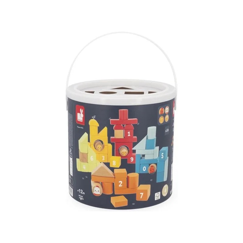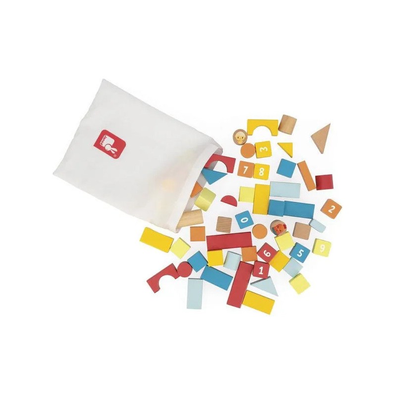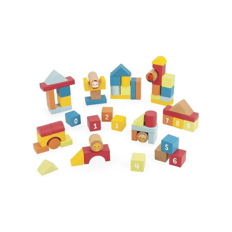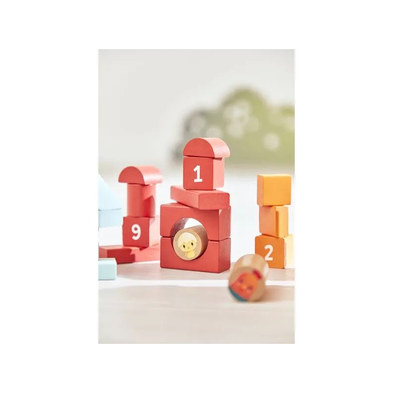 Bienvenue à la ferme des petits constructeurs ! Ce baril de 56 pièces sur le thème de la ferme permet aux enfants de créer leur propre univers fermier ! Ce jouet d'éveil stimule la motricité et l'imagination des tout-petits dès 12 mois. Ronds, carrés, triangles, ponts... les possibilités de constructions sont multiples... et parfois instables ! L’enfant empile les pièces et s'amuse à construire les éléments de sa ferme : granges, enclos ou poulaillers. Et parfois, tout tombe ! Mais que c'est rigolo ! Et puis c'est reparti pour un tour ! Ce jeu promet des heures d'amusement au autonomie ou avec des amis. Mais ce n’est pas tout : le baril cache aussi de jolies surprises ! Parmi les pièces se trouvent des illustrations d’animaux de la ferme: une poule, un coq et deux adorables poussins. C'est parfait pour inventer des histoires ! Ce jeu est également évolutif : il accompagne l’enfant dans ses apprentissages grâce à des cubes numérotés de 0 à 9 qui permettent de se familiariser avec les chiffres et d’apprendre à compter tout en s’amusant. Encore plus ludique, le baril fait aussi office de boîte à formes grâce à son couvercle découpé selon les formes des pièces. Les enfants apprennent à reconnaître les formes, à les manipuler et à les insérer au bon endroit. Livré avec un sac en coton, les pièces se rangent et se transportent facilement. Les pièces de construction sont fabriquées en bois Fsc™.