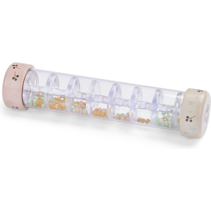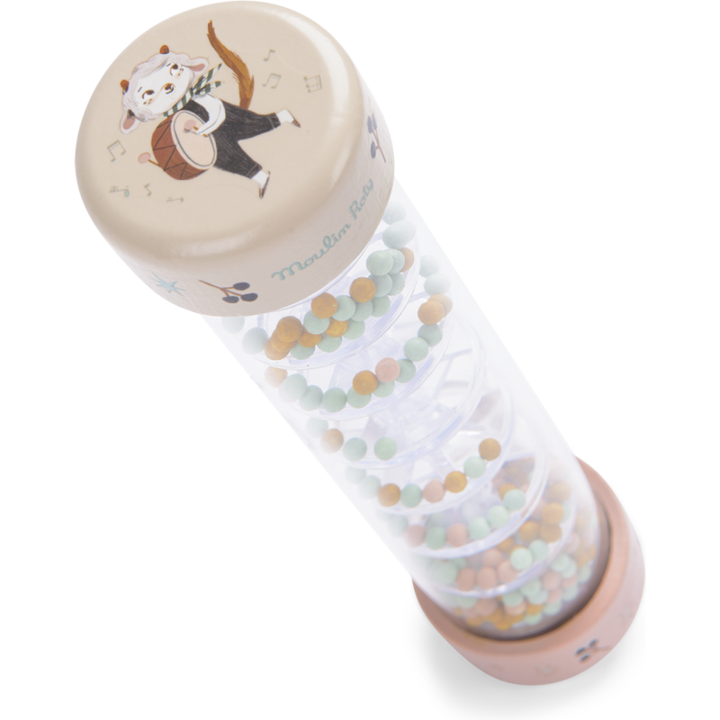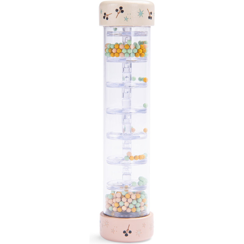 Bâton de pluie décoré des illustrations poétiques de la collection Après la pluie. Bébé s'amusera à secouer et retourner le bâton pour voir dévaler au travers des étages, les billes colorées, qui reproduisent le son apaisant de la pluie. 10m et +