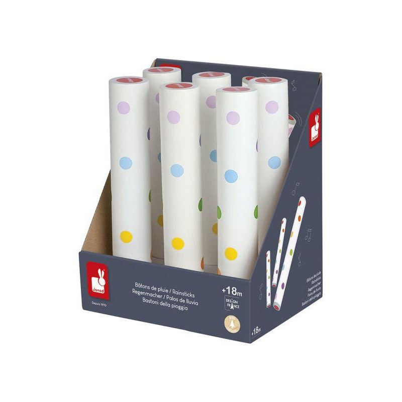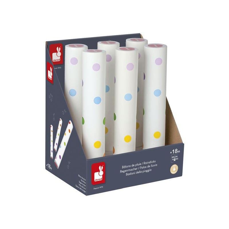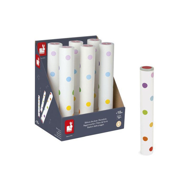 Bâton de pluie - Confetti. Renversez, inclinez ce baton fermé aux extrémités, des cailloux glissent dans ce tube et produisent un crépitement, le son d'une pluie. Confetti, c'est une gamme complète d'instruments de musique avec des motifs Pop N' Rock ! Confetti éveille tous les sens et permet aux plus jeunes musiciens de s'initier aux joies de l'improvisation musicale. Dimensions : dia. 4.5 x L 26.5 cm.