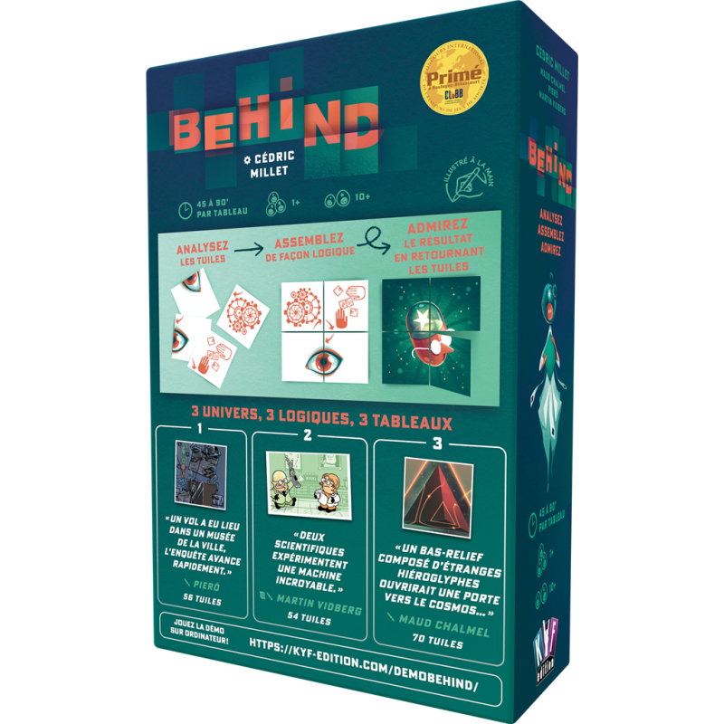 Behind est une expérience coopérative très originale : en solo mais aussi à plusieurs, échangez, débattez et laissez-vous immerger dans ces 3 tableaux à la mécanique inédite. Pas besoin d'apprendre des règles, choisissez un compartiment, sortez les tuiles sans les retourner et jouez instantanément !