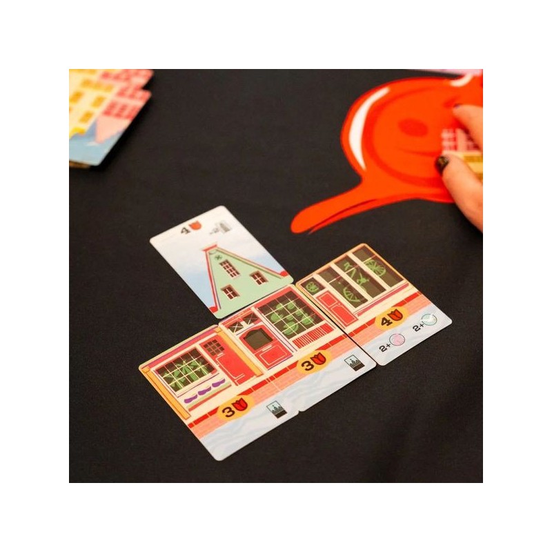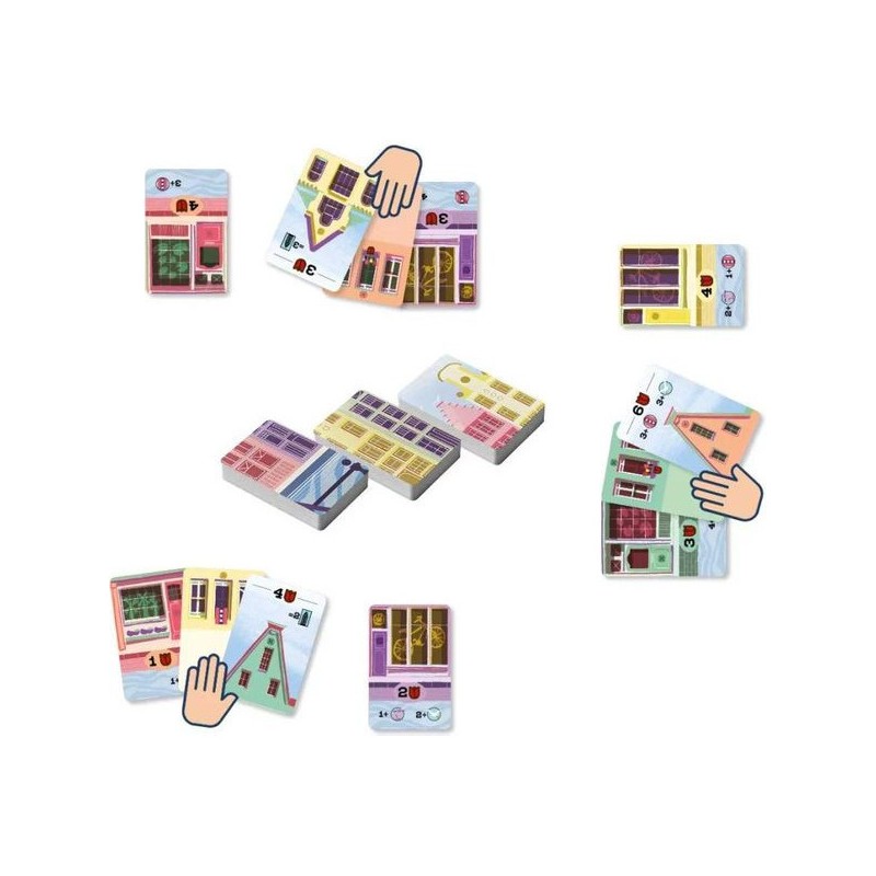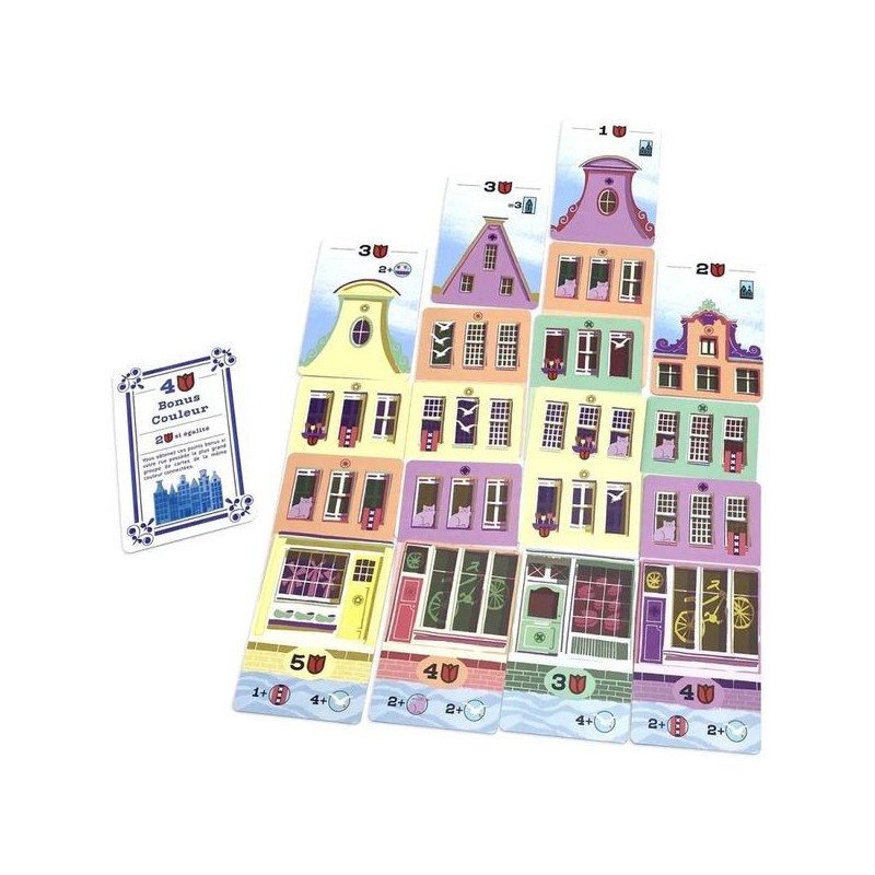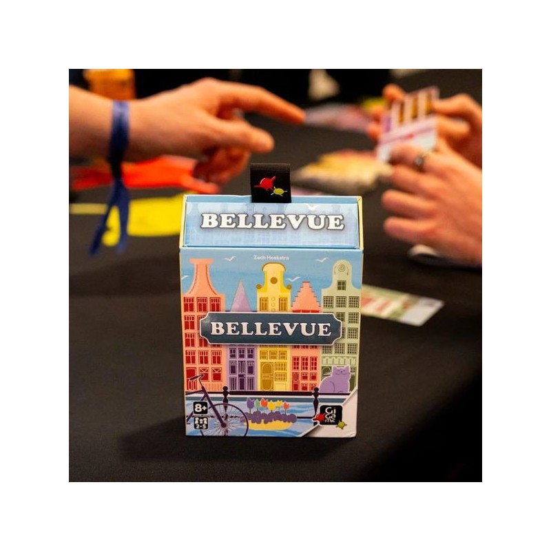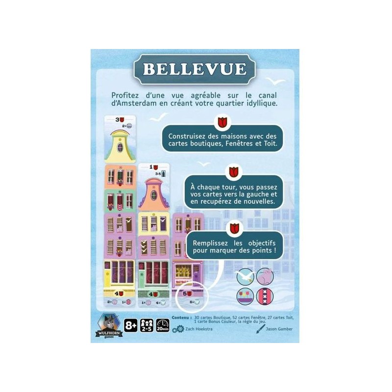 Bellevue est un jeu de pose de cartes agréable dans lequel vous créez votre rue en construisant des maisons d’architecture flamande typique sur le canal d’Amsterdam. Choisissez la meilleure carte de votre main à poser avant de les passer à vos adversaires. Vous devrez réaliser les objectifs de vos Boutiques et de vos Toits, tout en gardant un œil sur les couleurs afin de marquer le plus de points et de remporter la victoire !