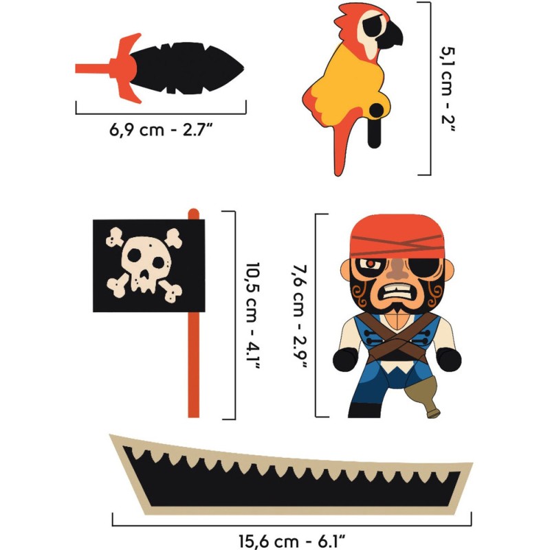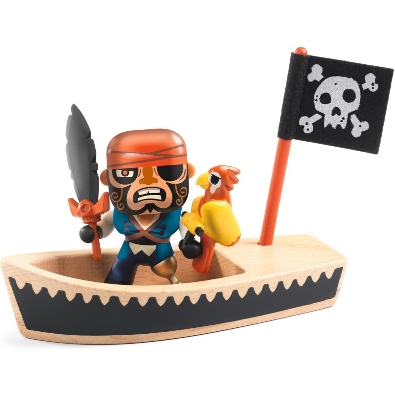 Contenu : 1 figurine + 2 accessoires (épée-perroquet) + 1 bateau en bois + 1 drapeau.