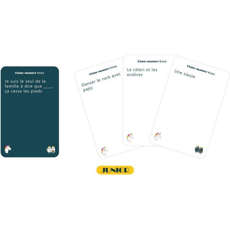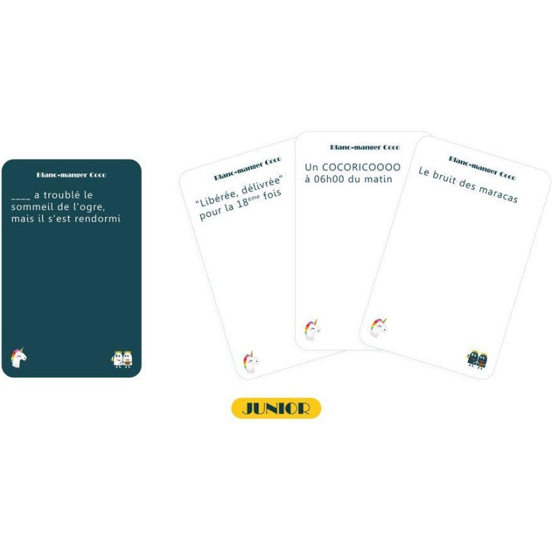 Les enfants aussi peuvent jouer à Blanc Manger Coco ! Avec cette édition junior, les enfants dès 8 ans peuvent s’amuser à créer des combinaisons de cartes hilarantes en comblant des phrases à trous. Parfait pour un après-midi en famille réussi !
