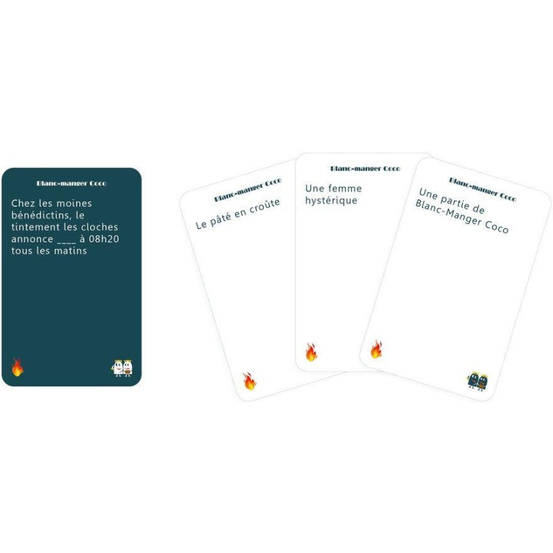Au début de la partie chaque joueur reçoit 11 cartes Réponse. Un premier joueur, le Question Master, pioche une carte Question, composée d’un texte à trou, et la lit aux autres joueurs. Chacun choisit la carte Réponse qu’il trouve la plus drôle pour compléter la phrase, et la transmet face cachée au Question Master. Le Question Master lit les Réponses et sélectionne celle de son choix. Celui qui l’a jouée marque un point. Pour gagner, il faudra réussir à faire les associations de cartes les plus décalées et drôles ! Grâce à des règles expliquées en 1min, on peut se lancer immédiatement dans une partie de Blanc Manger Coco. À l’apéro ou en soirée, c’est le jeu d’ambiance parfait pour rire de tout ! Avec ses 600 cartes, chaque partie est unique. Et pour aller encore plus loin, vous pouvez combiner toutes les boîtes de Blanc Manger Coco entre elles !