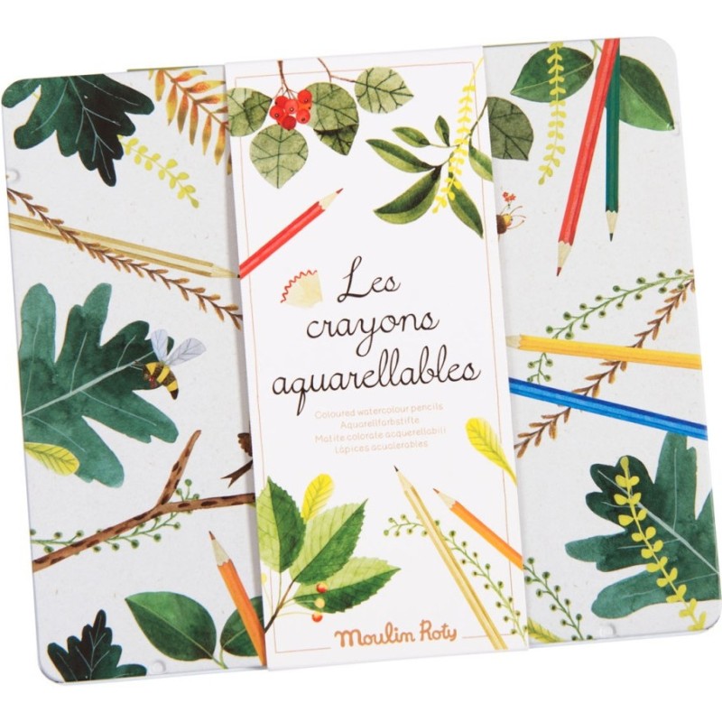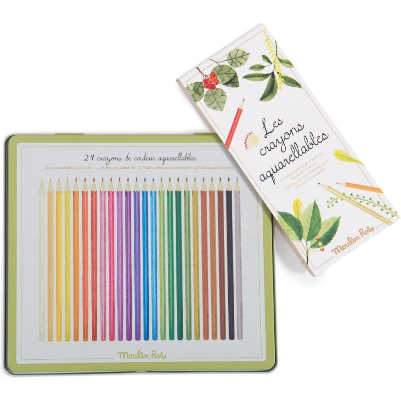 24 crayons aquarellables en bois aux couleurs vives, dans leur boîte en métal illustrée. Ils peuvent être utilisés comme crayons de couleur classiques, ou en faisant un bel effet aquarelle en les trempant dans l'eau ou en passant un pinceau humide.