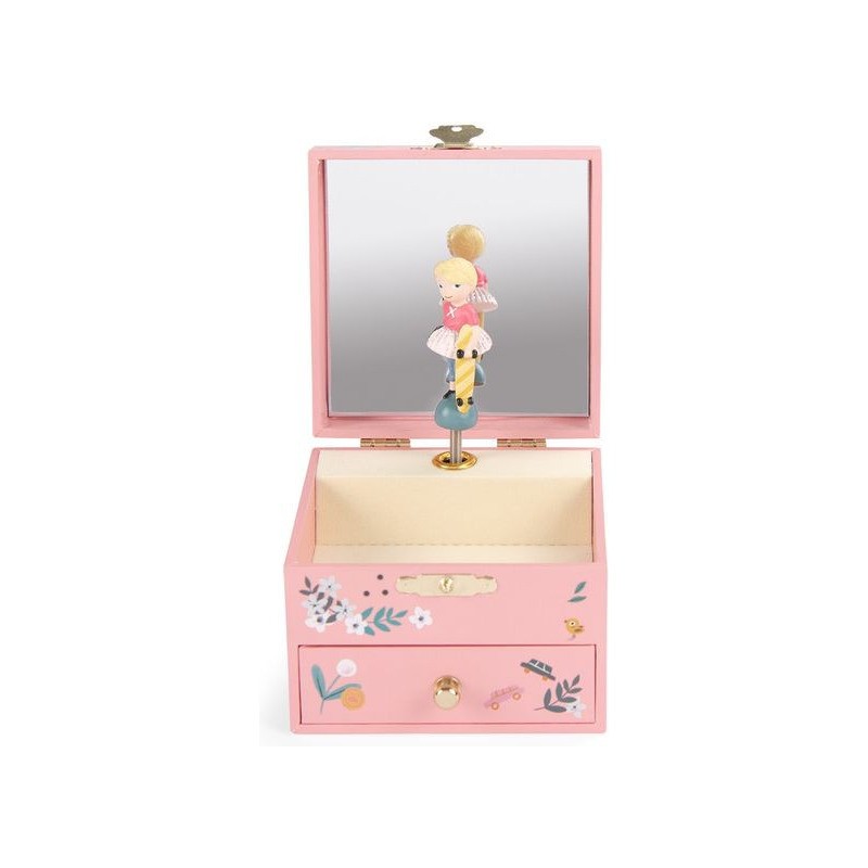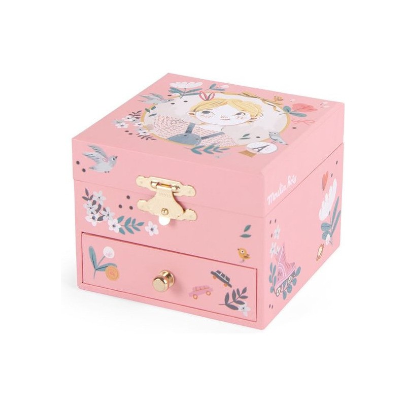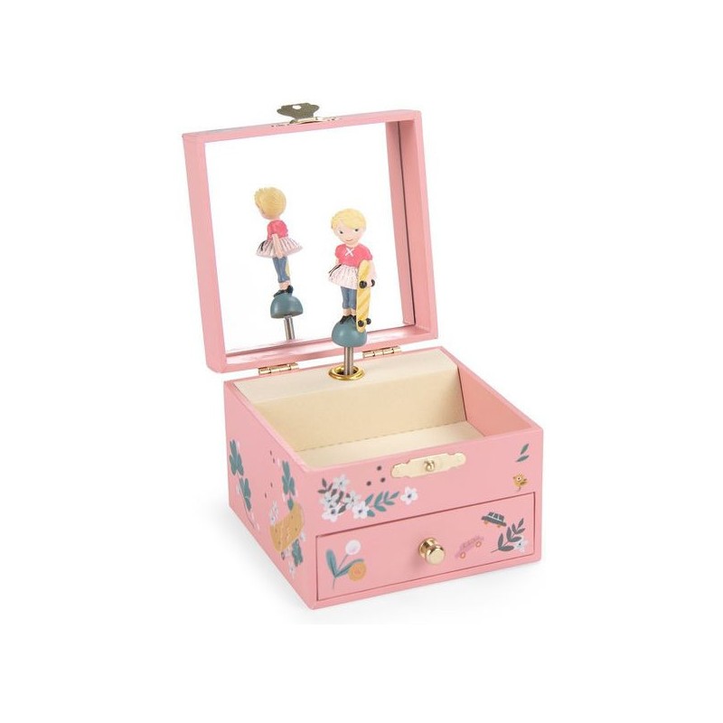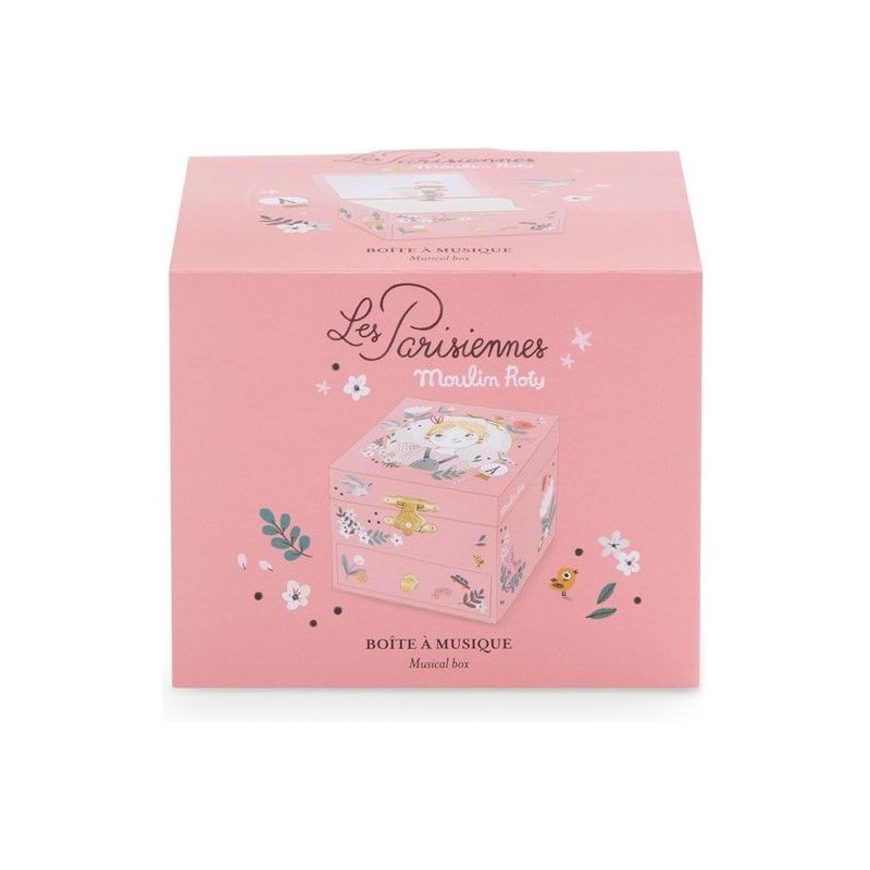 Boîte à musique Les Parisiennes. illustrée par Lucille Michieli. Ouvre la boite et regarde tourner par dessus les toits de Paris. l'intrépide Églantine avec son skate sous le bras. Dispose d'un coffret pour ranger ses bijoux et ses petits secrets.