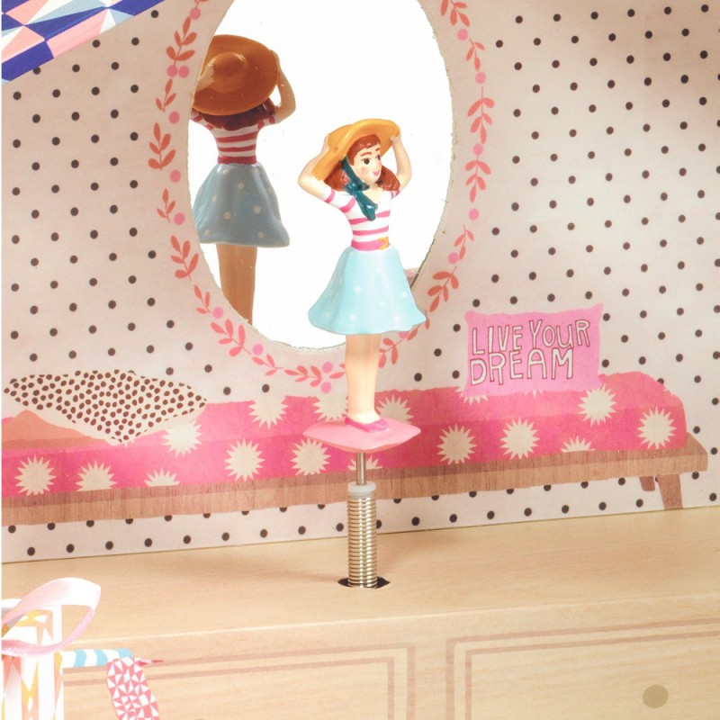 Contenu : une boîte à musique coffret en bois recouverte de papier avec une jolie figurine, 3 tiroirs.