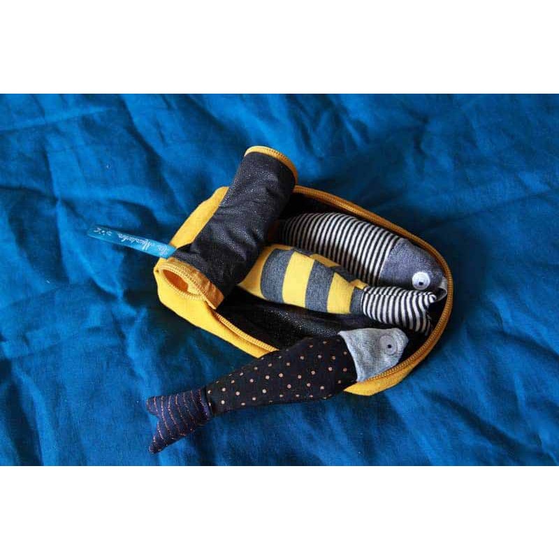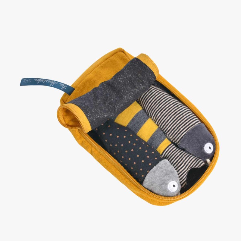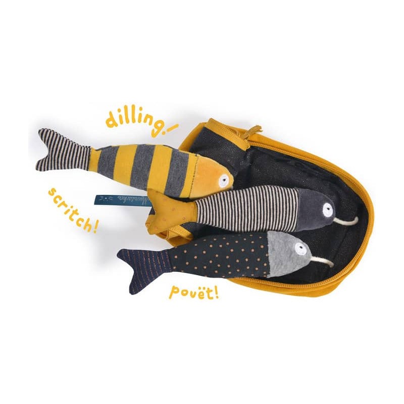 Une belle boite à sardine avec un pouet-pouet dans un poisson, un hochet dans un autre et un plastique qui fait du bruit dans le dernier. Mais qui est ce tendre trio moustachu ? À la tombée de la nuit, les Moustaches jouent de la musique sur les toits, sous l’œil amusé de Monsieur Hibou, leur fidèle compagnon.