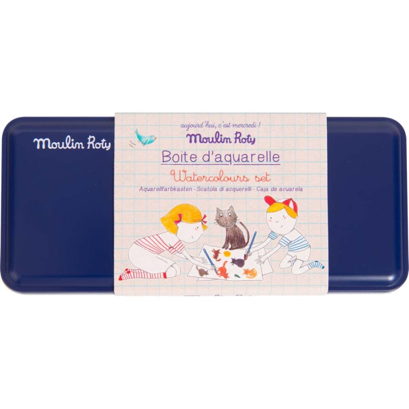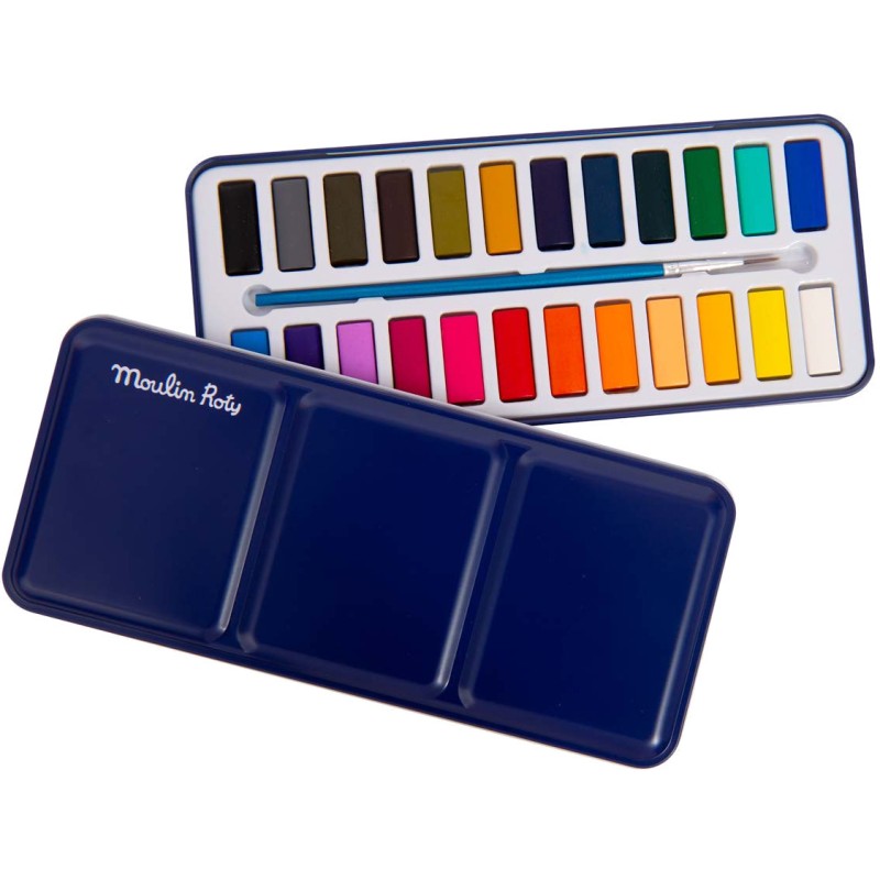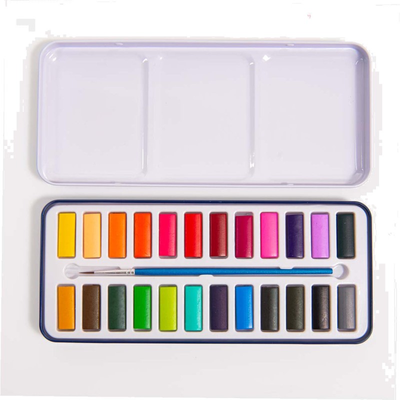 Boîte en métal avec 24 godets aquarelles aux couleurs intenses, un pinceau avec réservoir d'eau et une éponge. La boîte servira également de palette pour créer des mélanges de couleurs. Idéal pour débuter la peinture !