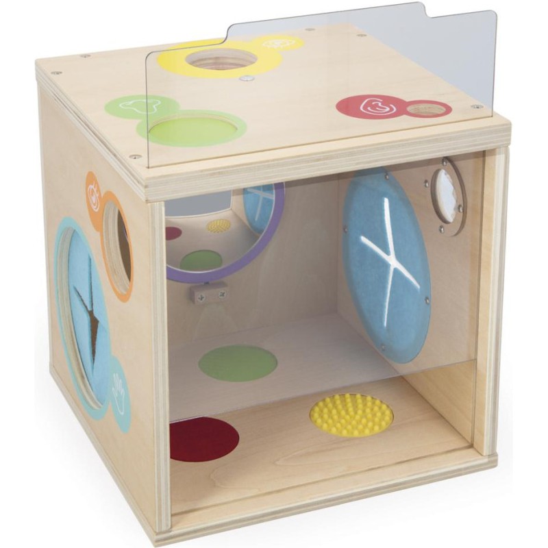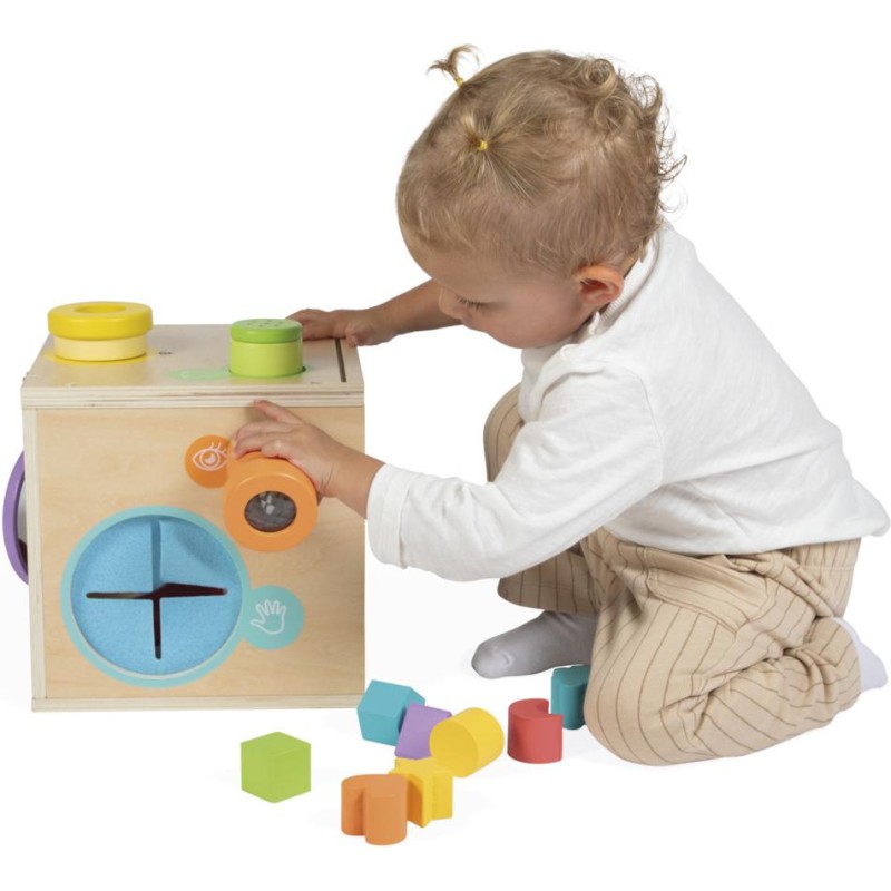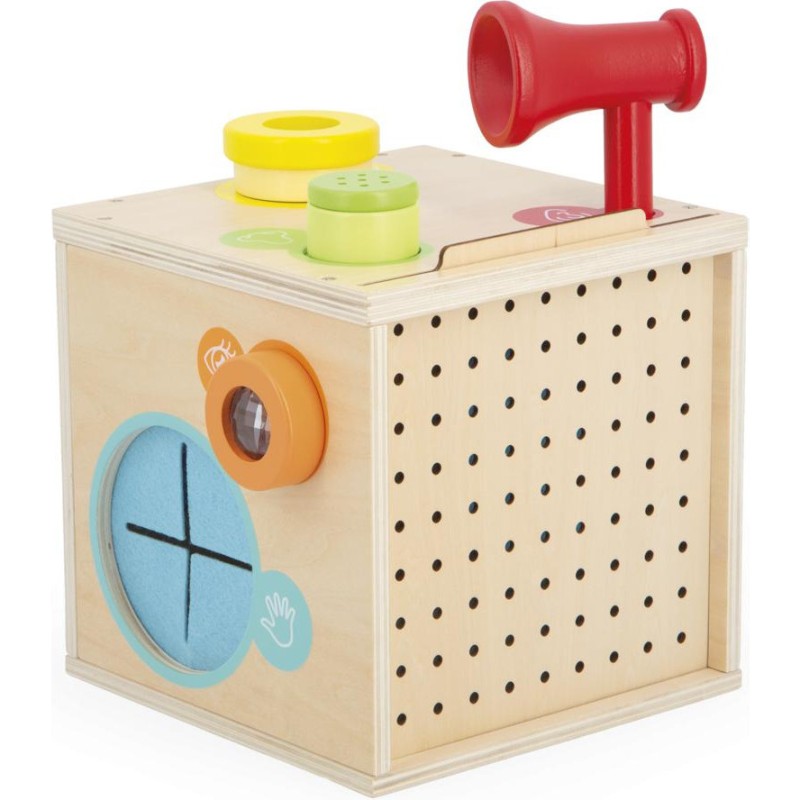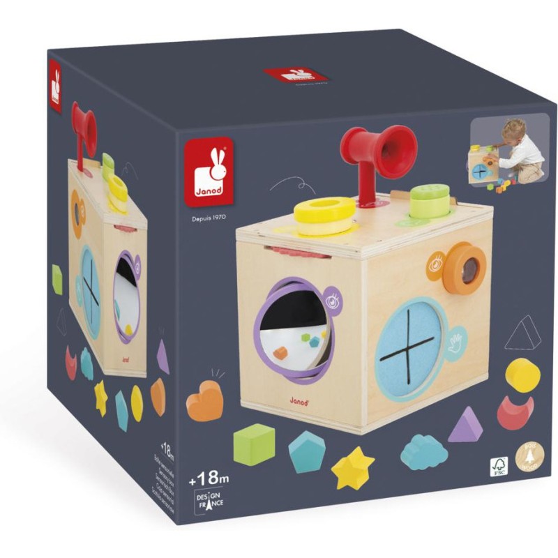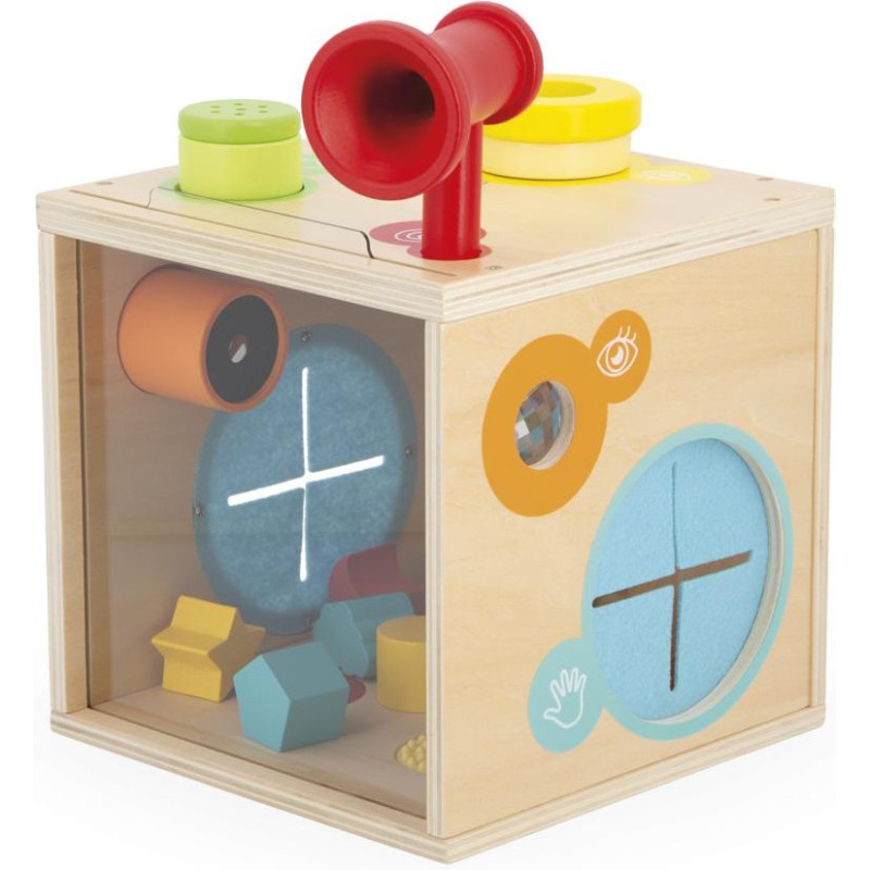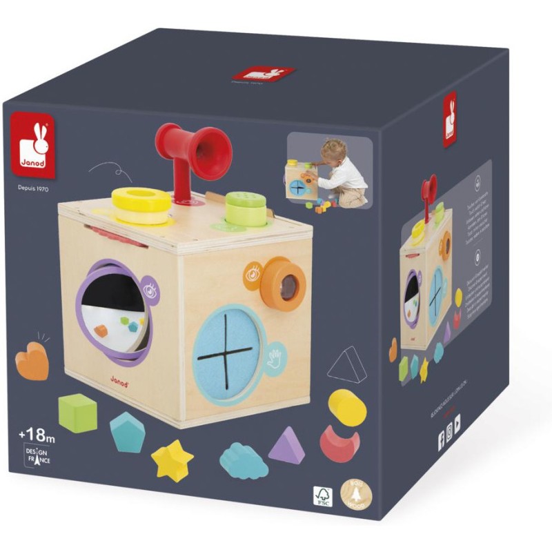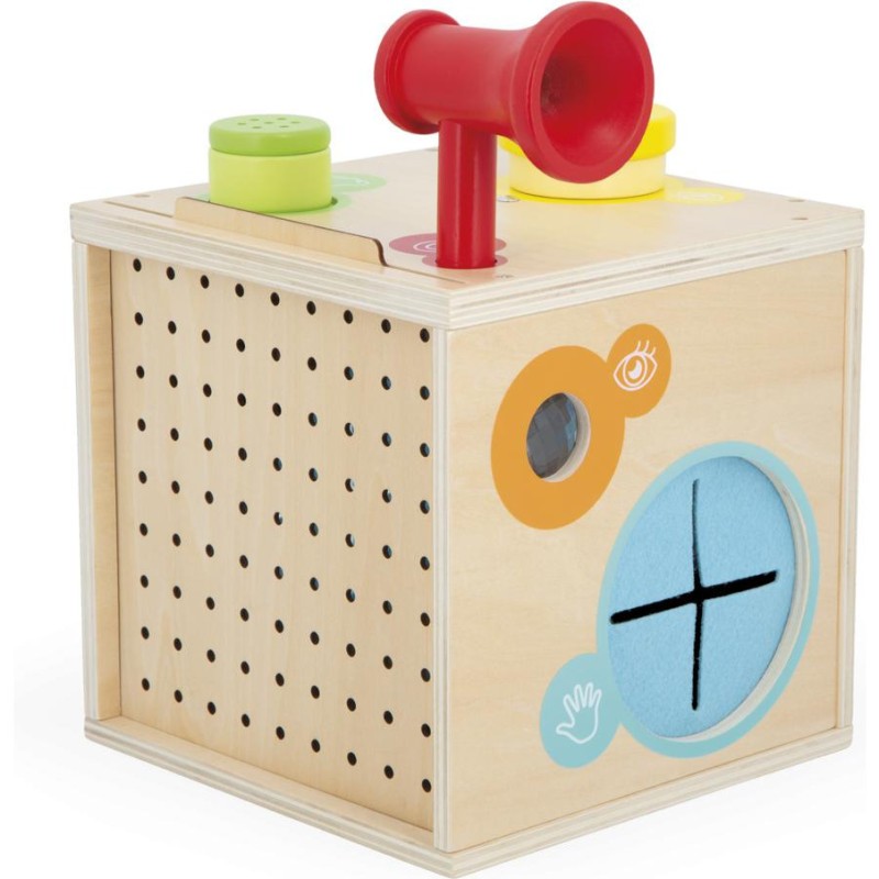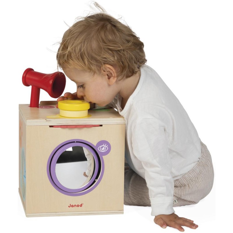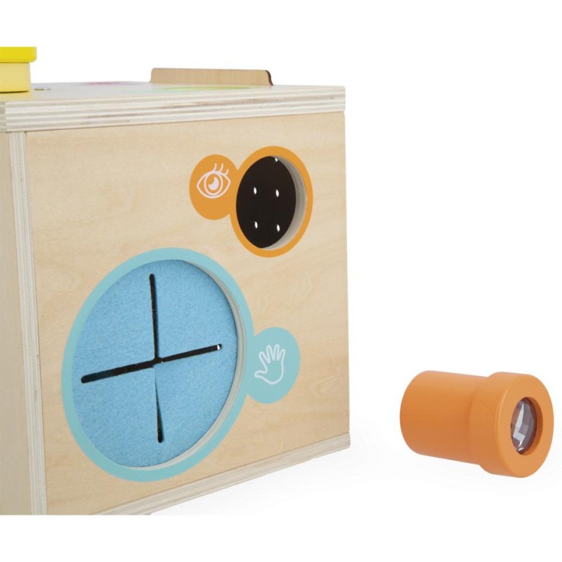 Stimulez les sens de bébé avec cette boîte sensorielle ! Adapté aux enfants et aux bébés dès 18 mois, ce cube d’activités en bois permet de stimuler 4 des 5 sens. Avec lui, les petits développent leur odorat, leur ouïe, leur toucher et leur vue ; le tout grâce à des activités ludiques à faire en votre compagnie ! Pour cela, les expériences sensorielles se multiplient sur toutes les faces de ce jouet d’éveil, et même à l’intérieur, pour toujours plus de fun et de découvertes. 12 accessoires sont également inclus pour expérimenter au travers de la manipulation. Ce jouet éducatif est un chouette moyen d’encourager la curiosité et d’éveiller les sens, pour mieux comprendre le monde qui nous entoure ! Pour stimuler l’odorat, une boîte perforée accueille des éléments olfactifs qu’un adulte place à l’intérieur : épices, fruits, fleurs … Les odeurs jouent un rôle important dans la construction de la mémoire et de l’identité de l’enfant. Elles renforcent le lien entre lui et son environnement. Pour stimuler l’ouïe, un mégaphone permet de faire l’expérience de l’amplification de la voix : trop rigolo ! Quant au toucher, vous trouverez 2 entrées de part et d’autre de la boîte (une pour chaque main). À l’intérieur de la boîte, vous placez les 8 formes incluses qu’il faudra alors deviner à l’aveugle, ou tout autre objet amusant ! Enfin, pour stimuler la vue, un judas permet de voir ce qui se trouve dans la boîte au travers de filtres en couleur. Un miroir rotatif avec un côté simple, et l’autre grossissant, permet de s’observer de manière ludique ! Aussi, un petit kaléidoscope sur la boîte permet de voir à l’intérieur d’une tout autre manière encore. Pour apporter plus ou moins de lumière dans la boîte, 2 grandes plaques (plastique et bois) sont amovibles et apportent plus ou moins de difficulté pour reconnaître les objets à l’intérieur. Ce cube sensoriel est idéal pour des heures de complicité avec votre enfant ! Son petit plus ? Chaque sens est associé à une couleur et à un symbole sur la boîte. Livré avec un livret explicatif. Composée de bois issu de forets gérées durablement, certifié Fsc™, cette boîte sensorielle en bois fait partie de notre gamme « Sensoriel » : des jouets hautement préhensibles et robustes, qui favorisent et stimulent le développement des sens des tout-petits.