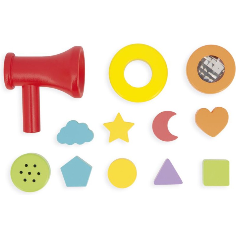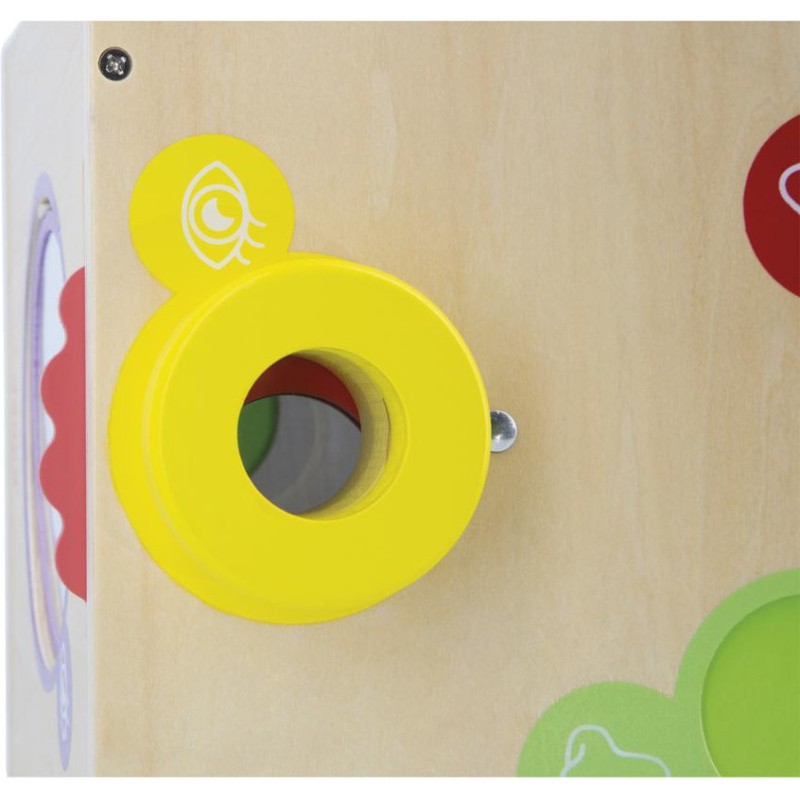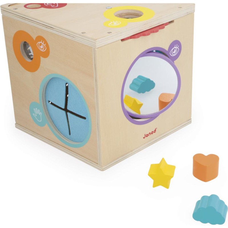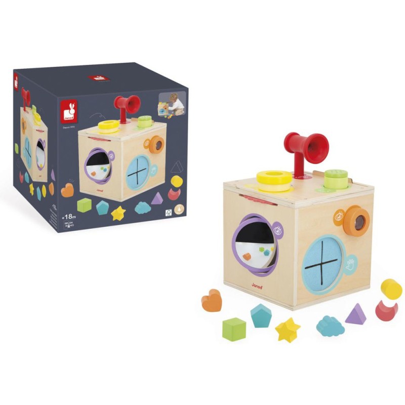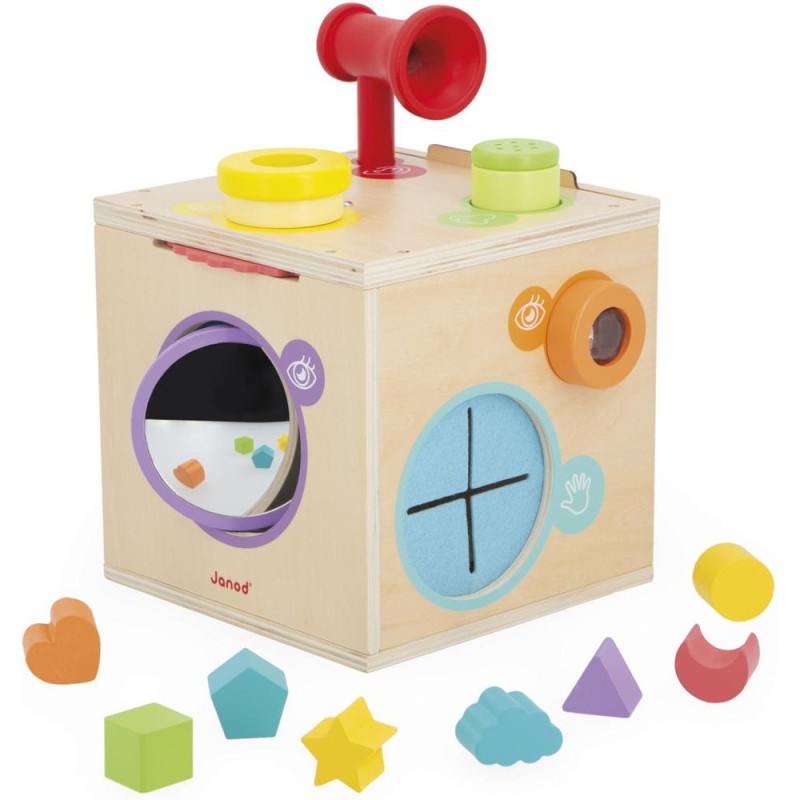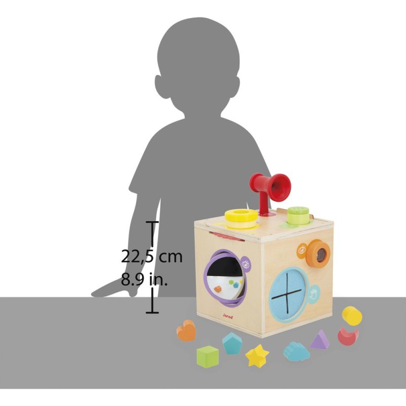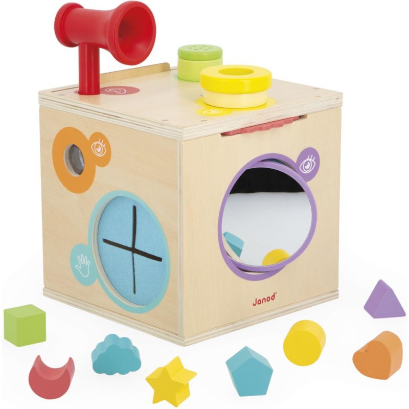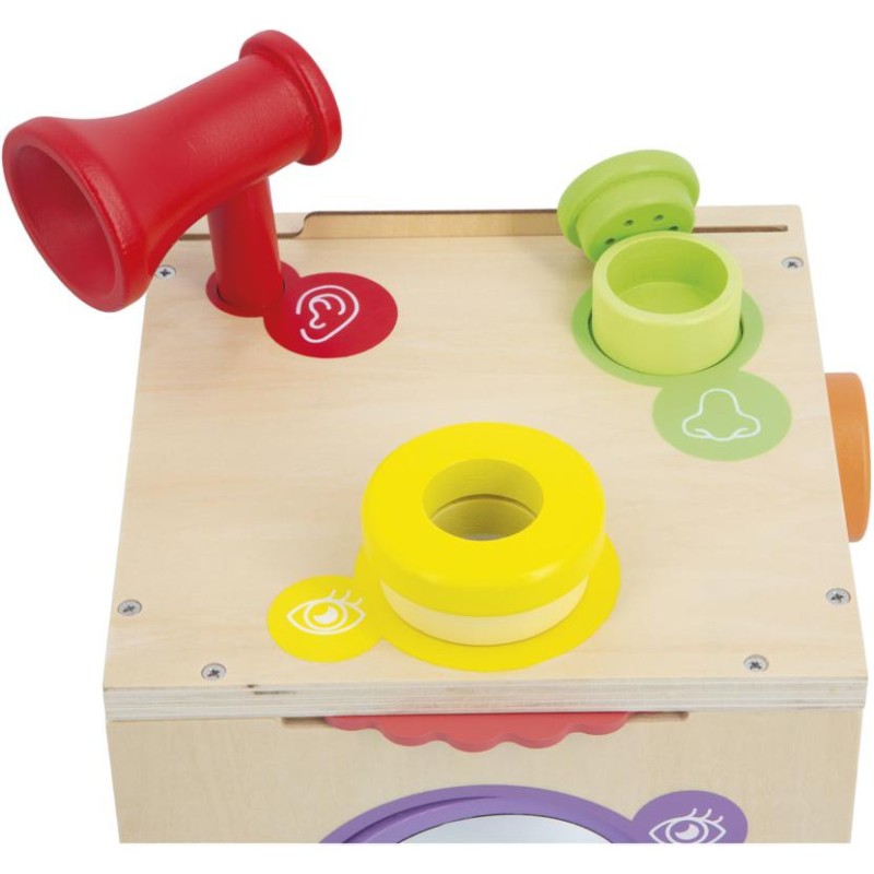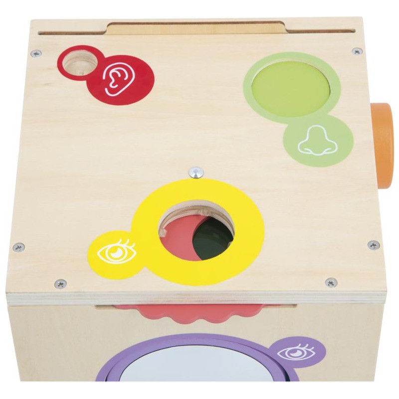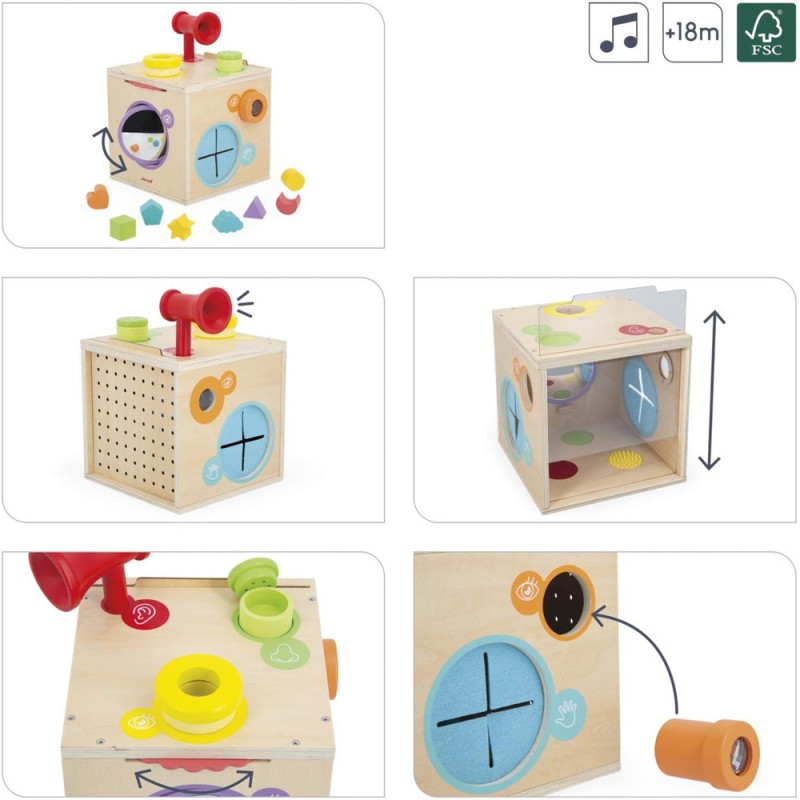 Stimulez les sens de bébé avec cette boîte sensorielle ! Adapté aux enfants et aux bébés dès 18 mois, ce cube d’activités en bois permet de stimuler 4 des 5 sens. Avec lui, les petits développent leur odorat, leur ouïe, leur toucher et leur vue ; le tout grâce à des activités ludiques à faire en votre compagnie ! Pour cela, les expériences sensorielles se multiplient sur toutes les faces de ce jouet d’éveil, et même à l’intérieur, pour toujours plus de fun et de découvertes. 12 accessoires sont également inclus pour expérimenter au travers de la manipulation. Ce jouet éducatif est un chouette moyen d’encourager la curiosité et d’éveiller les sens, pour mieux comprendre le monde qui nous entoure ! Pour stimuler l’odorat, une boîte perforée accueille des éléments olfactifs qu’un adulte place à l’intérieur : épices, fruits, fleurs … Les odeurs jouent un rôle important dans la construction de la mémoire et de l’identité de l’enfant. Elles renforcent le lien entre lui et son environnement. Pour stimuler l’ouïe, un mégaphone permet de faire l’expérience de l’amplification de la voix : trop rigolo ! Quant au toucher, vous trouverez 2 entrées de part et d’autre de la boîte (une pour chaque main). À l’intérieur de la boîte, vous placez les 8 formes incluses qu’il faudra alors deviner à l’aveugle, ou tout autre objet amusant ! Enfin, pour stimuler la vue, un judas permet de voir ce qui se trouve dans la boîte au travers de filtres en couleur. Un miroir rotatif avec un côté simple, et l’autre grossissant, permet de s’observer de manière ludique ! Aussi, un petit kaléidoscope sur la boîte permet de voir à l’intérieur d’une tout autre manière encore. Pour apporter plus ou moins de lumière dans la boîte, 2 grandes plaques (plastique et bois) sont amovibles et apportent plus ou moins de difficulté pour reconnaître les objets à l’intérieur. Ce cube sensoriel est idéal pour des heures de complicité avec votre enfant ! Son petit plus ? Chaque sens est associé à une couleur et à un symbole sur la boîte. Livré avec un livret explicatif. Composée de bois issu de forets gérées durablement, certifié Fsc™, cette boîte sensorielle en bois fait partie de notre gamme « Sensoriel » : des jouets hautement préhensibles et robustes, qui favorisent et stimulent le développement des sens des tout-petits.