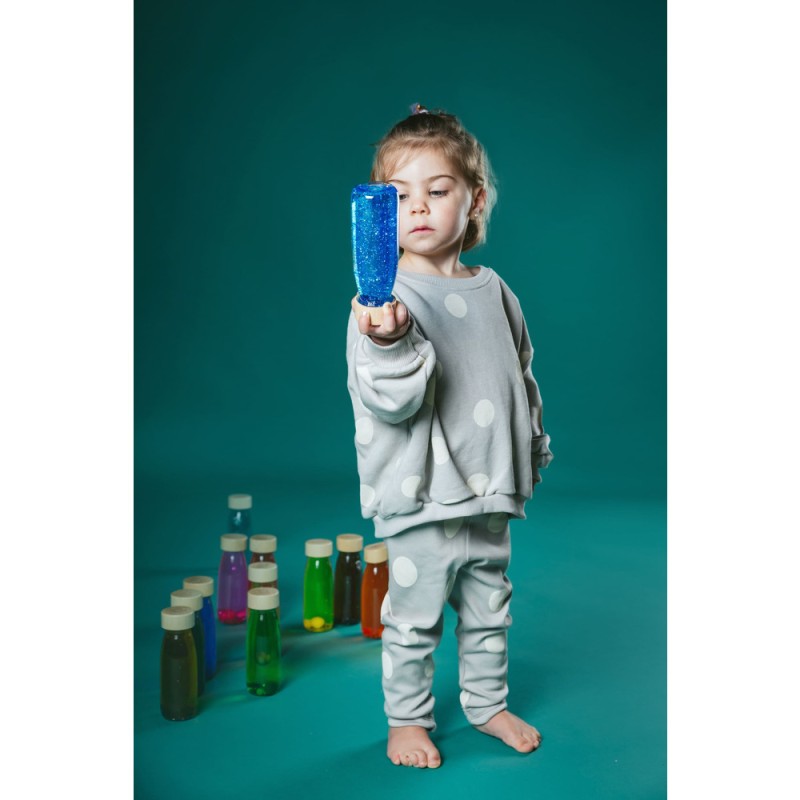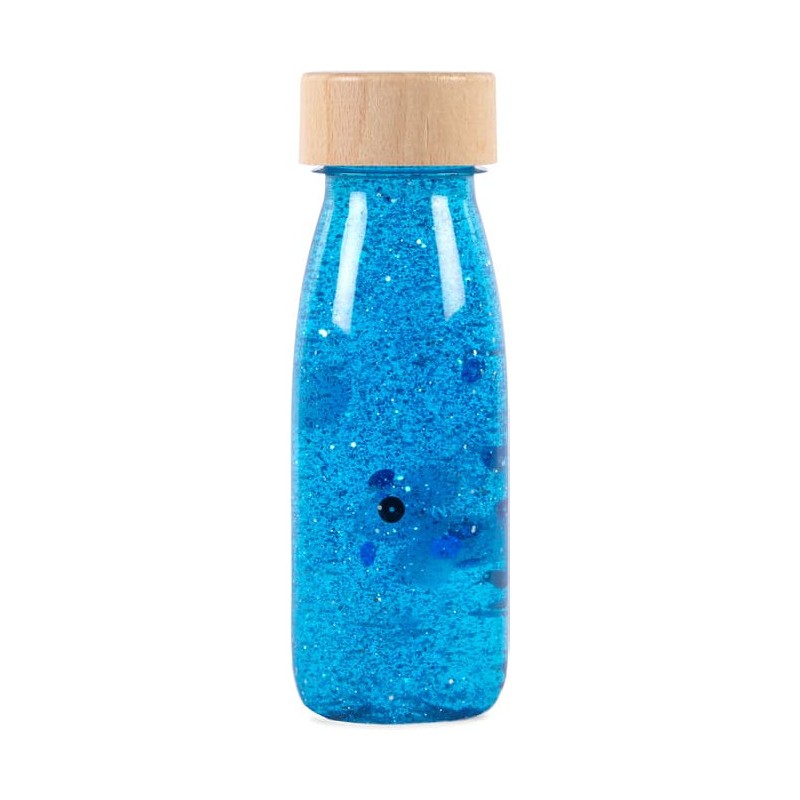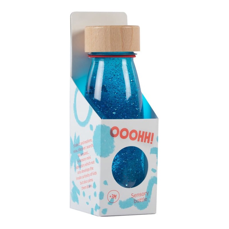 Découvrez la bouteille sensorielle Float bleu de la marque Petit Boum. Un jouet d’éveil coloré, inspiré de la pédagogie Montessori, qui stimule les sens des bébés dès 3 mois. Cette bouteille sensorielle fait partie de la gamme Float Bottle. Petit Boum a attrapé une à une les couleurs de l'arc-ciel pour créer ces flacons magiques. Jeux de lumière, pompons, paillettes et étoiles… Votre enfant s'amusera à faire rouler et à secouer le flacon, il s'émerveillera devant les éléments qui flottent et qui glissent le long des parois. Une invitation à explorer, à éveiller les sens et la curiosité des plus petits, et à entrer dans un univers calme et relaxant. Fabriquée à la main en Espagne, à partir de plastique recyclable, d'un bouchon en bois d'érable et d'éléments naturels, la bouteille sensorielle Petit Boum est incassable. Elle est pensée et conçue pour les enfants dès 3 mois. L'intérieur est étanche et chaque bouteille dispose d'un double bouchon entièrement scellé pour que les petits puissent la manipuler en toute sécurité. Les flacons sensoriels Petit Boum sont exemptés de Bpa, de métal et de phtalates. Dimensions de la bouteille sensorielle : 14 x 4 cm.