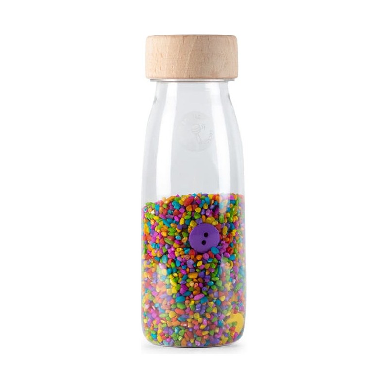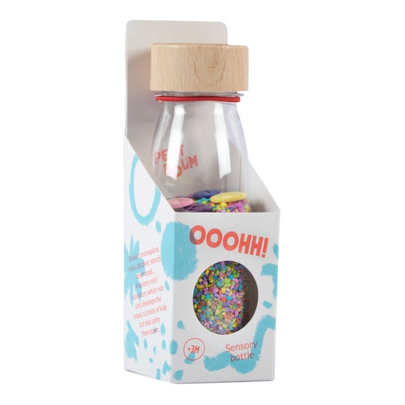 Découvrez la bouteille sensorielle Sound Boutons de la marque Petit Boum. Un jouet d’éveil coloré, inspiré de la pédagogie Montessori, qui stimule les sens des bébés dès 3 mois. Une bouteille à secouer qui va stimuler le sens auditif de votre enfant, qui va aussi explorer chaque détail et se détendre en observant le contenu du flacon. Plusieurs boutons se cachent dans une multitude de grains colorés. Votre enfant va pouvoir observer, agiter et découvrir le son joyeux d'une douce explosion de couleurs. Une invitation à explorer, à éveiller les sens et la curiosité des plus petits. Fabriquée à la main en Espagne, à partir de plastique recyclable, d'un bouchon en bois d'érable et d'éléments naturels, la bouteille sensorielle Petit Boum est incassable. Elle est pensée et conçue pour les enfants dès 3 mois. L'intérieur est étanche et chaque bouteille dispose d'un double bouchon entièrement scellé pour que les petits puissent la manipuler en toute sécurité. Les flacons sensoriels Petit Boum sont exemptés de Bpa, de métal et de phtalates. Dimensions de la bouteille sensorielle : 14 x 4 cm.