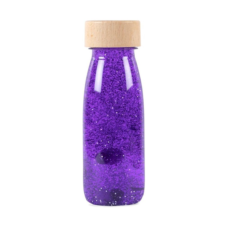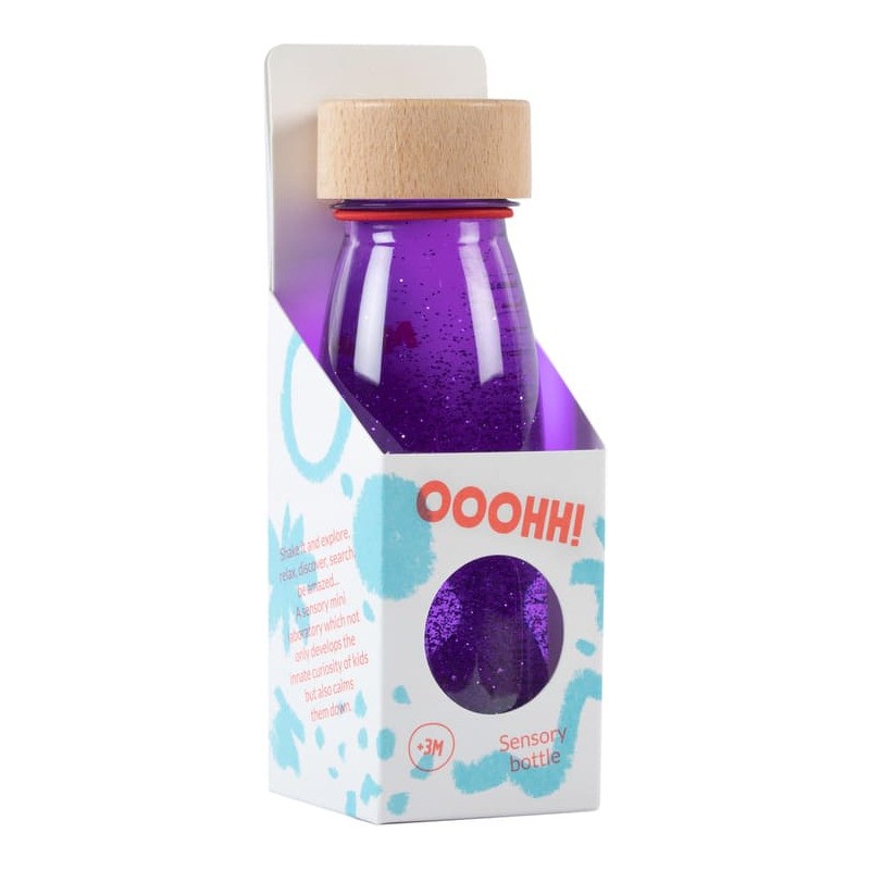 Découvrez la bouteille sensorielle Float violet de la marque Petit Boum. Un jouet d’éveil coloré, inspiré de la pédagogie Montessori, qui stimule les sens des bébés dès 3 mois. Cette bouteille sensorielle fait partie de la gamme Float Bottle. Petit Boum a attrapé une à une les couleurs de l'arc-ciel pour créer ces flacons magiques. Jeux de lumière, pompons, paillettes et étoiles… Votre enfant s'amusera à faire rouler et à secouer le flacon, il s'émerveillera devant les éléments qui flottent et qui glissent le long des parois. Une invitation à explorer, à éveiller les sens et la curiosité des plus petits, et à entrer dans un univers calme et relaxant. Fabriquée à la main en Espagne, à partir de plastique recyclable, d'un bouchon en bois d'érable et d'éléments naturels, la bouteille sensorielle Petit Boum est incassable. Elle est pensée et conçue pour les enfants dès 3 mois. L'intérieur est étanche et chaque bouteille dispose d'un double bouchon entièrement scellé pour que les petits puissent la manipuler en toute sécurité. Les flacons sensoriels Petit Boum sont exemptés de Bpa, de métal et de phtalates. Dimensions de la bouteille sensorielle : 14 x 4 cm.